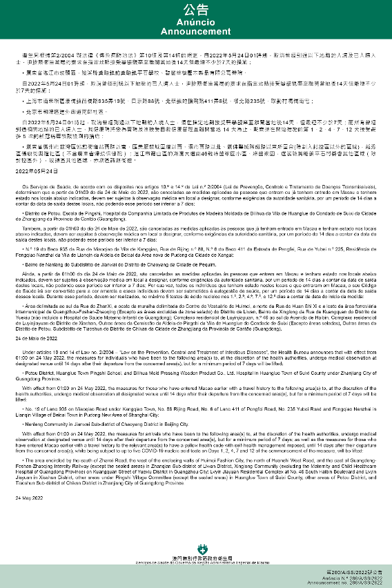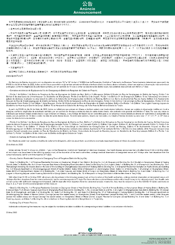 新型冠狀病毒感染應變協調中心(下稱應變協調中心)宣佈,因應內地的疫情變化,衛生局根據第2/2004號法律《傳染病防治法》第10條和第14條的規定,自2022年5月24日凌晨1時起,所有曾經到過以下地點的入境及已入境人士,須按照衛生當局的要求在指定地點接受醫學觀察至離開當地後14天但最短不少於7天: