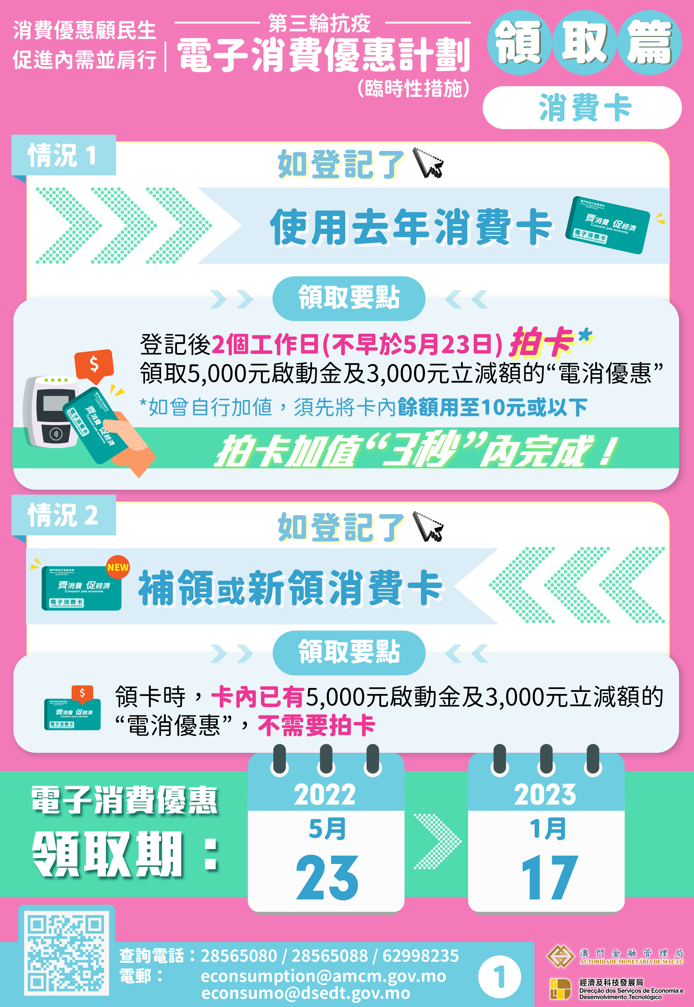 居民如登記使用仍有效的消費卡領取優惠,5月18日前完成登記的居民今日起可到全澳174個拍卡加值點拍卡領取優惠(拍卡服務點:https://www.dsedt.gov.mo/econsumo/zh-hant/topup_loc.jsp )。如5月18日後登記的居民,則於登記後2個工作日可進行拍卡。