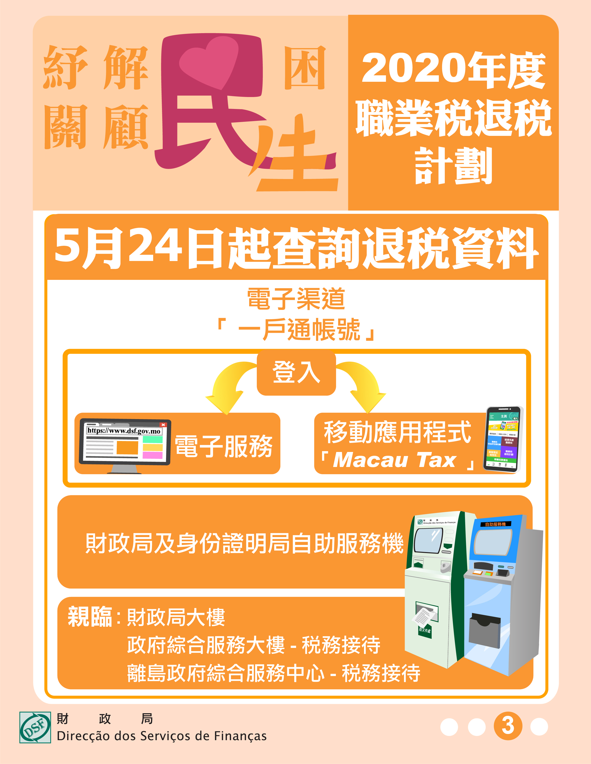 自5月24日起納稅人可透過以下多個途徑,查閱個人職業稅退稅資料:(一)透過“一戶通帳號”直接登入財政局網頁“電子服務”及移動應用程式“澳門稅務資訊Macau Tax”;(二) 於財政局或身份證明局的自助服務機插入納稅人澳門居民身份證查閱,以及 (三) 親臨財政局三個服務點。
