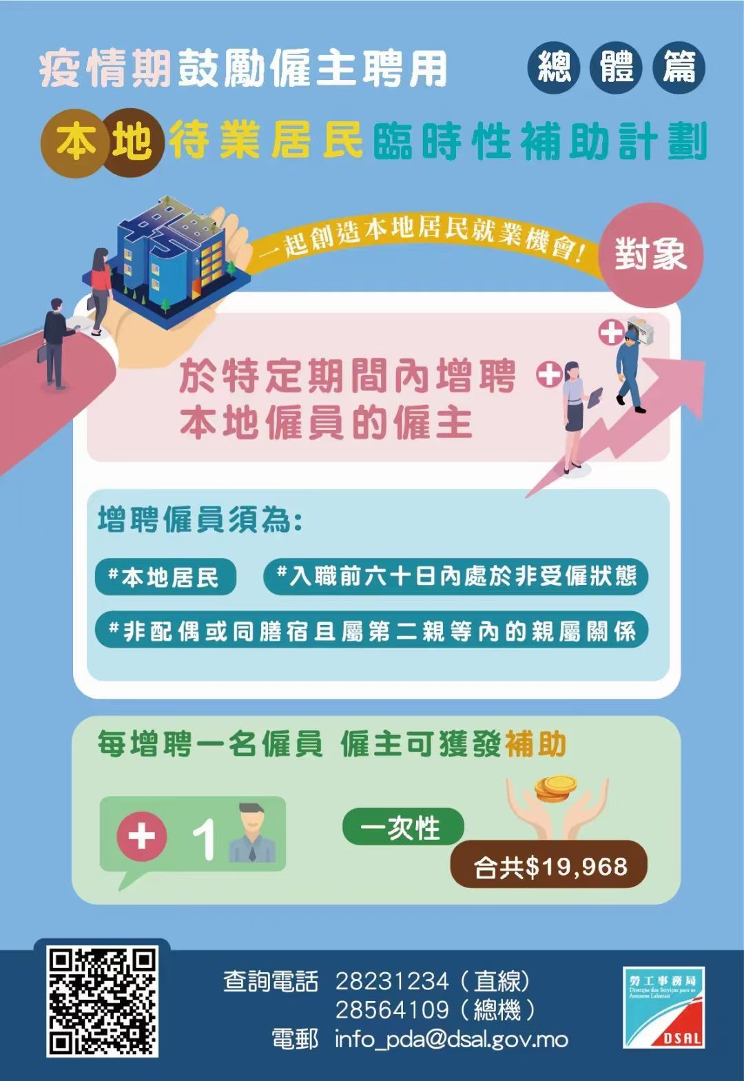 凡於上述增聘期內,每增聘一名本地待業居民,即入職前60日內處於非受僱狀態,僱主可獲發放為期6個月的臨時性補助,每月補助金額為澳門元3,328元(一次性獲發合共澳門元19,968元)。
