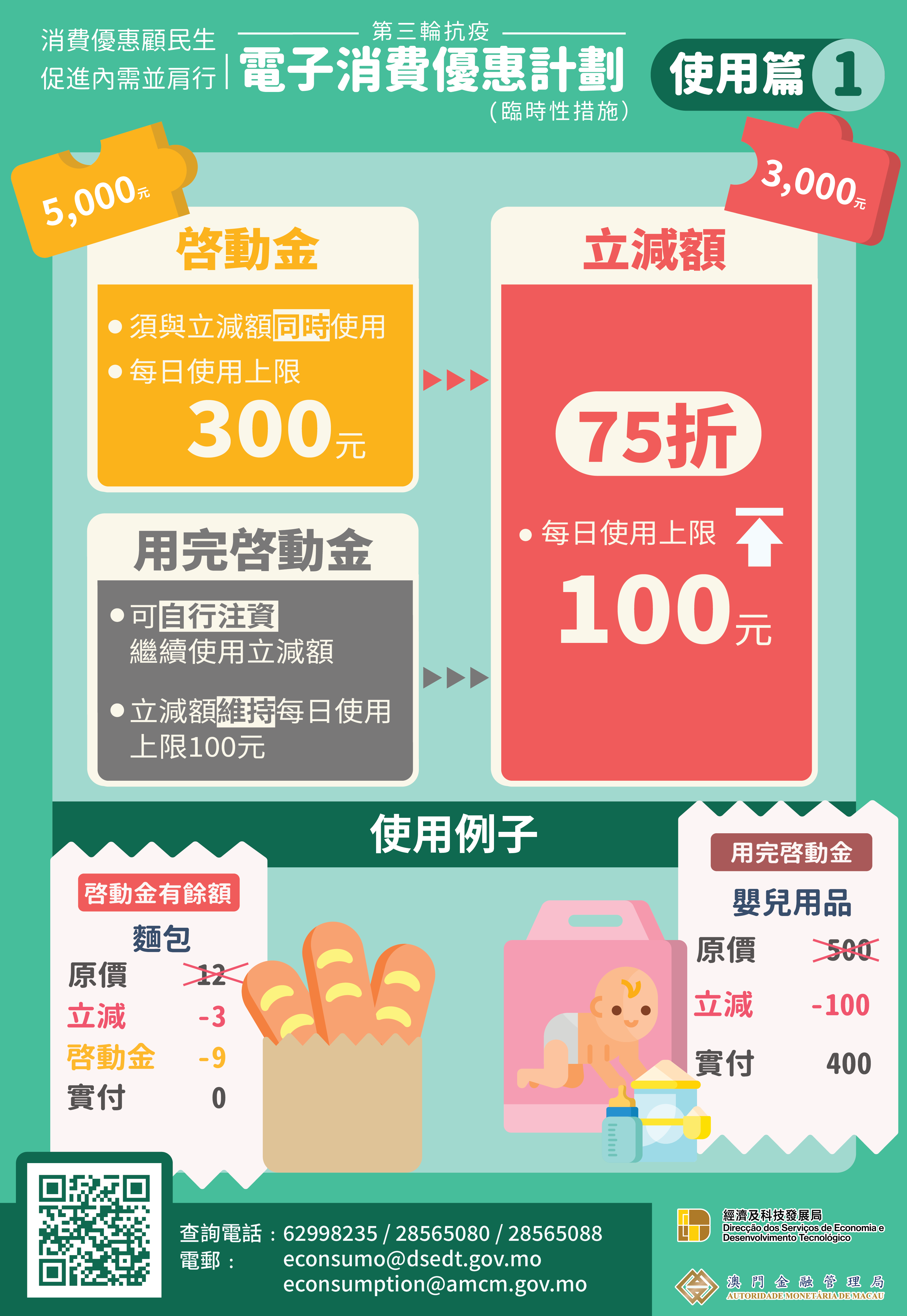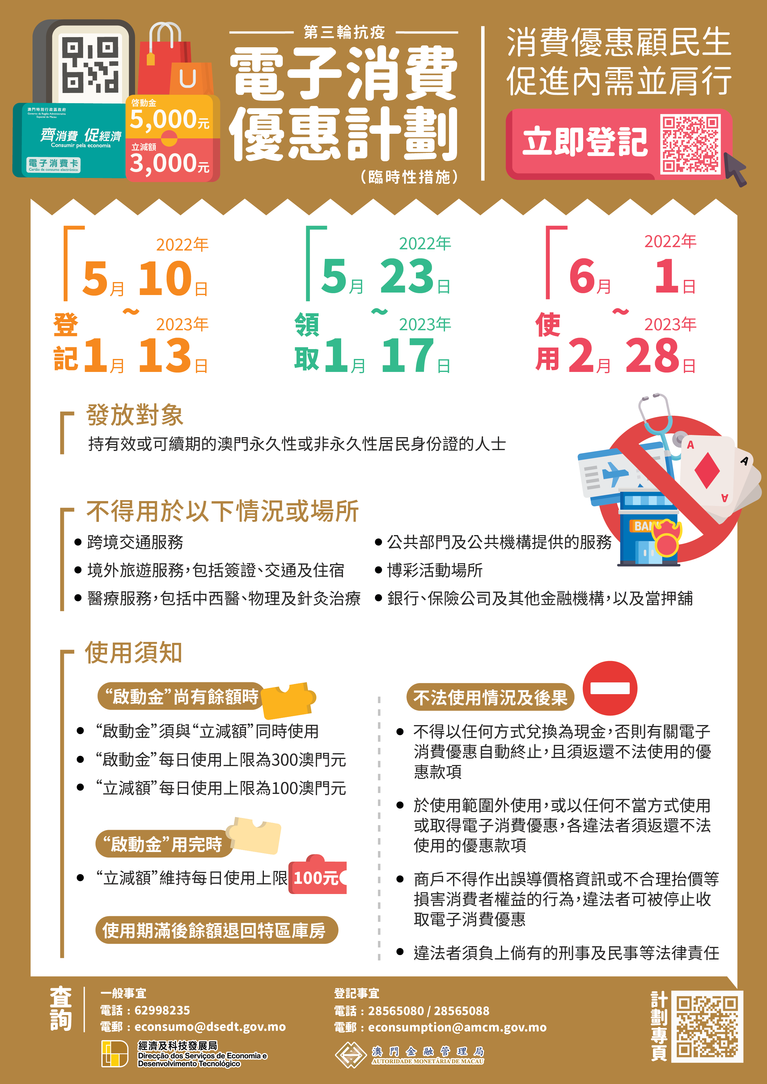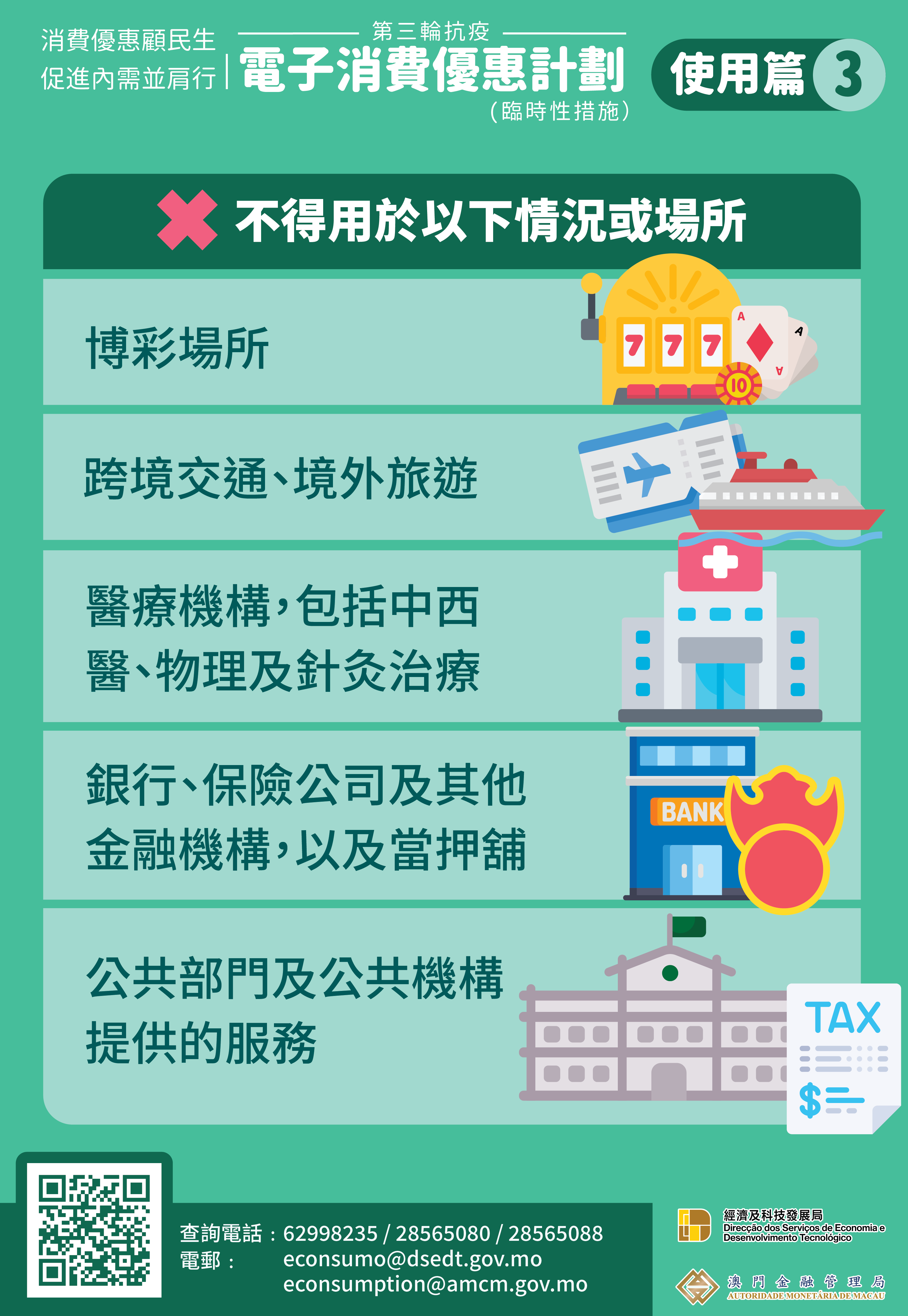 電子消費優惠僅可用於在澳門購買貨品或服務,但不得用於博彩場所、境外旅遊服務、跨境交通服務、醫療服務、金融機構等法規訂定的特定場所或用途。