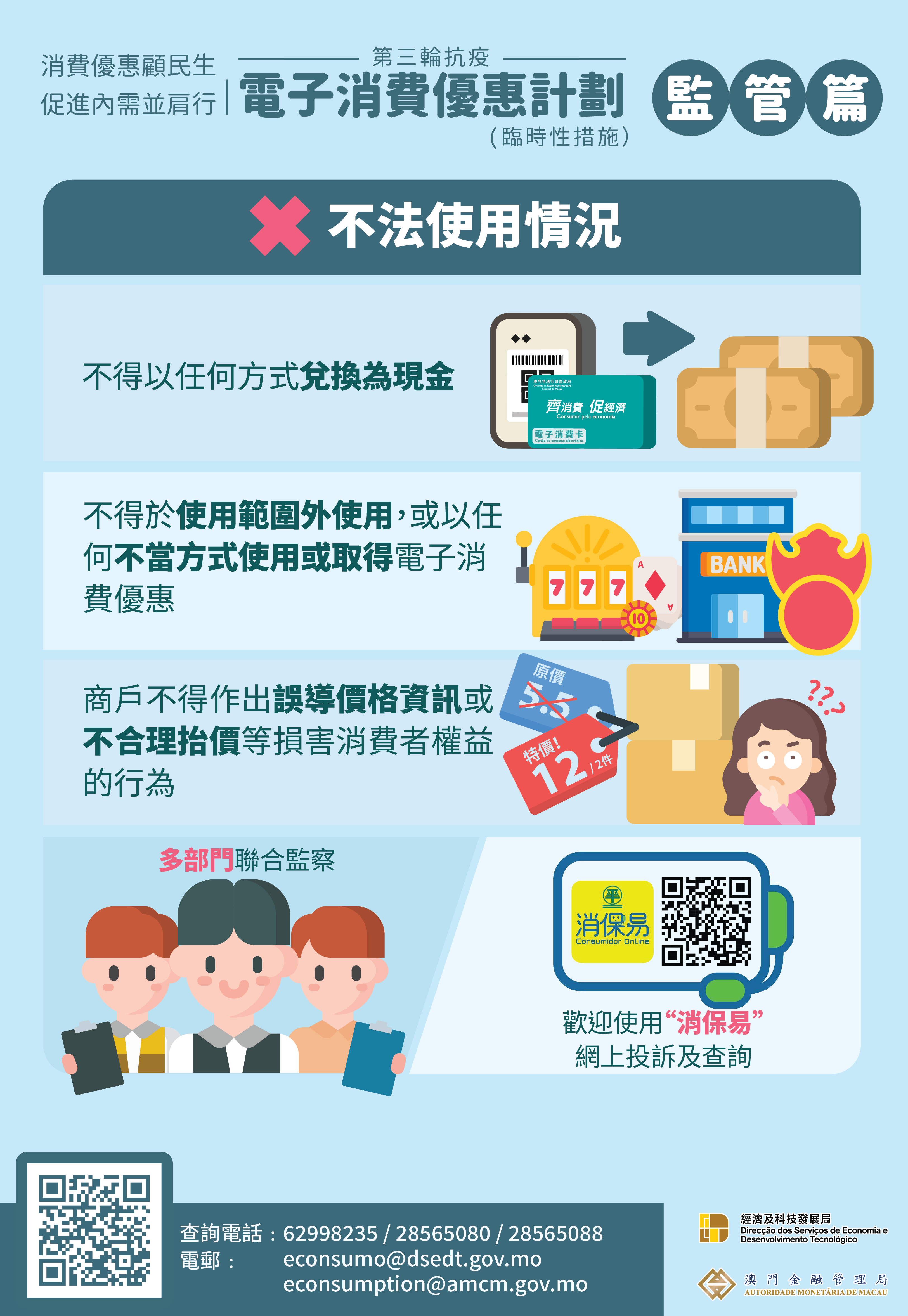 商戶除不得以不法方式收取電子消費優惠外,亦不得作出誤導價格資訊或不合理抬價等損害消費者權益的行為,且須履行充分合作的義務。如發現違規情況,經科局可按相關行為的嚴重性及過錯程度,停止所屬商業企業主的全部或部分商業場所在指定期間內收取電子消費優惠。
