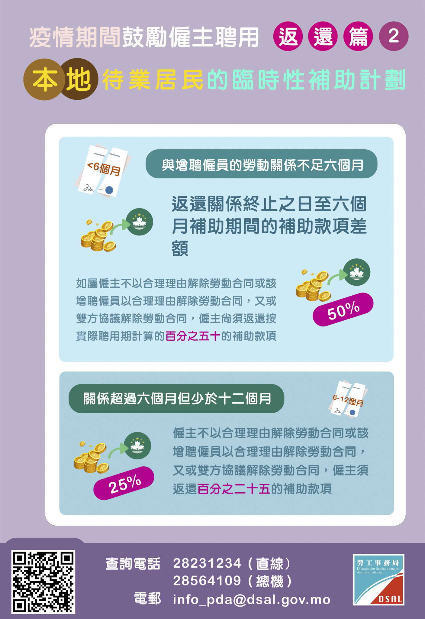 有關計劃詳情和申請辦法,可瀏覽勞工局網頁 www.dsal.gov.mo 或致電2823 1234查詢。