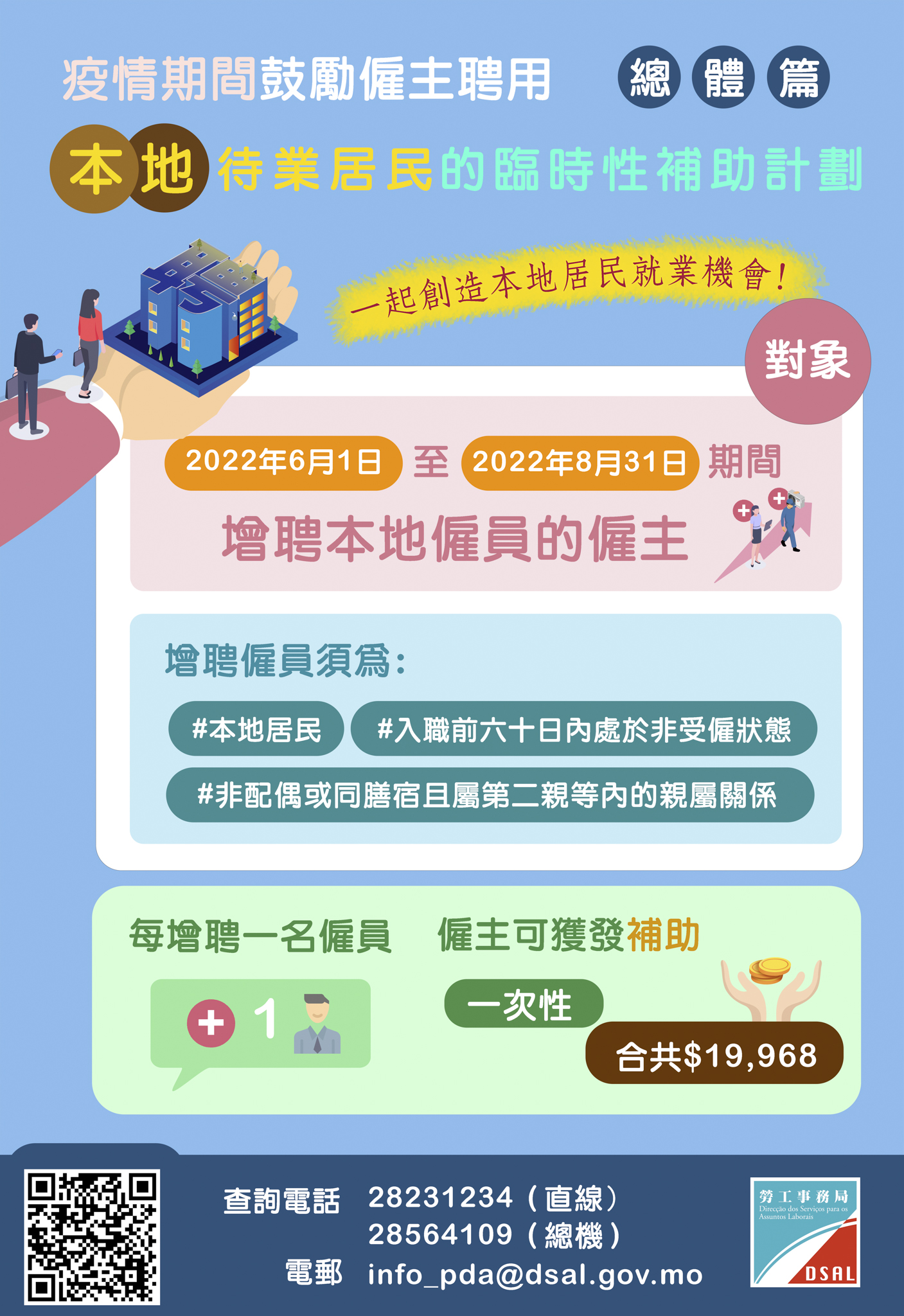 為增加就業崗位,促進及穩定本地待業居民就業,勞工事務局於今年6月1日至8月31日期間推出《疫情期間鼓勵僱主聘用本地待業居民的臨時性補助計劃》,僱主每增聘一名本地待業居民,可獲一次性發放一萬九千九百六十八澳門元的補助款項,補助名額不設上限。
