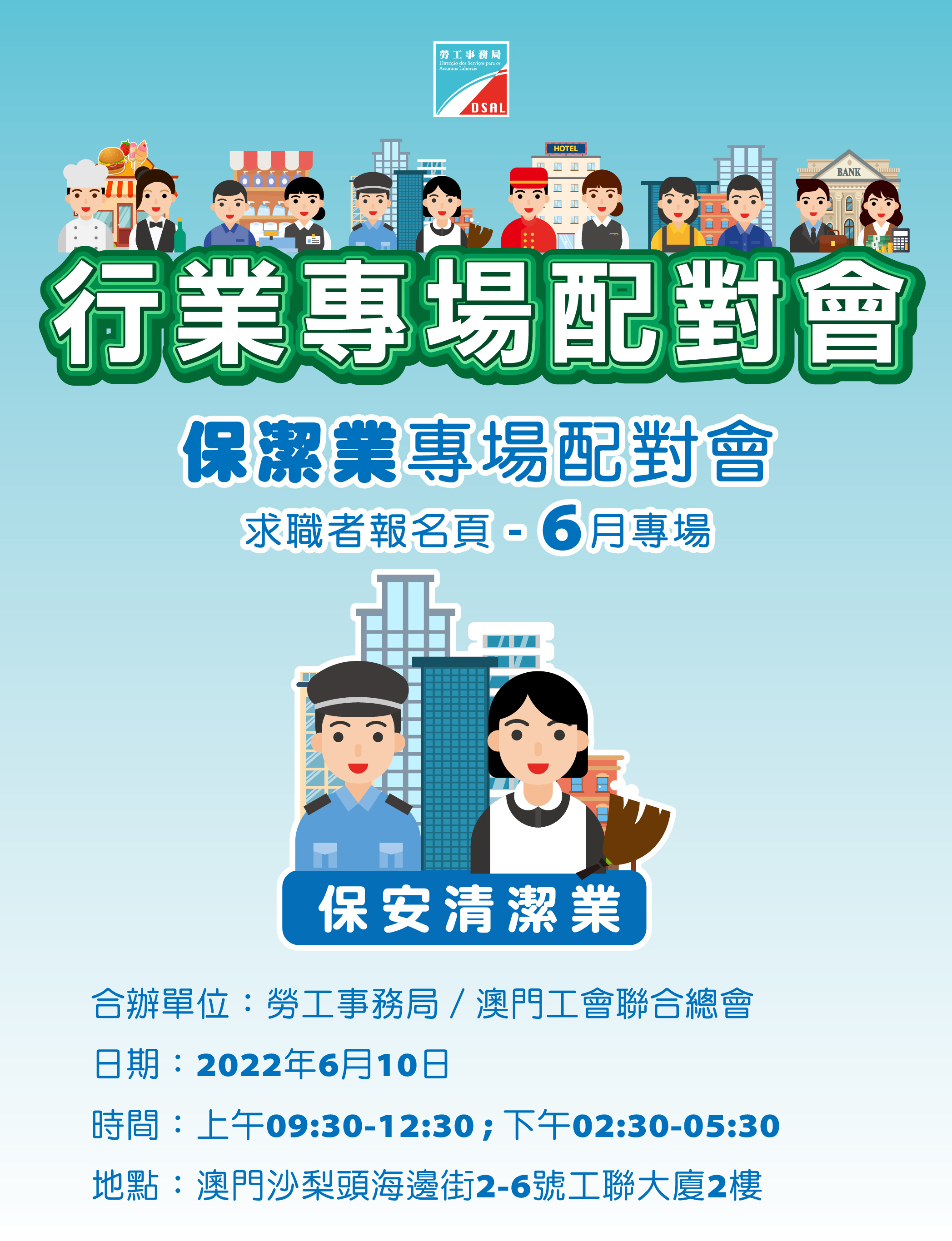 保潔業配對會定於6月10日在澳門工會聯合總會(澳門沙梨頭海邊街2-6號工聯大廈二樓)舉行,配對會分上下午兩場,招聘保安員及清潔員職位,共提供超過100個職位空缺。勞工局和工聯將透過恆常方式聯繫尋找相關工作的求職者報名參加是次配對會,同時歡迎有意從事保潔業的本澳居民報名參與,報名期由即日起至6月9日中午12時止,名額有限,額滿即止。其餘配對會將於稍後時間陸續開始接受報名,請留意勞工局最新訊息。