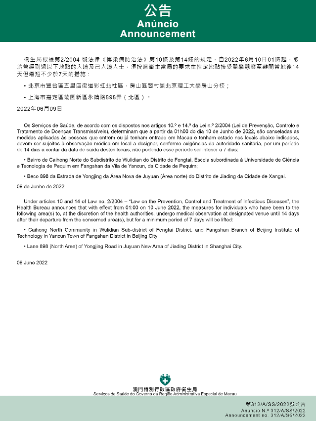 新型冠狀病毒感染應變協調中心(下稱應變協調中心)宣佈,因應內地的疫情變化,衛生局根據第2/2004號法律《傳染病防治法》第10條和第14條的規定,自2022年6月10日凌晨1時起,所有離開以下地點不足14天的入境人士和已入境人士,應留意自身健康狀況,期間健康碼不變黃色,但應主動按第1、4、7天的時序接受核酸檢測:
