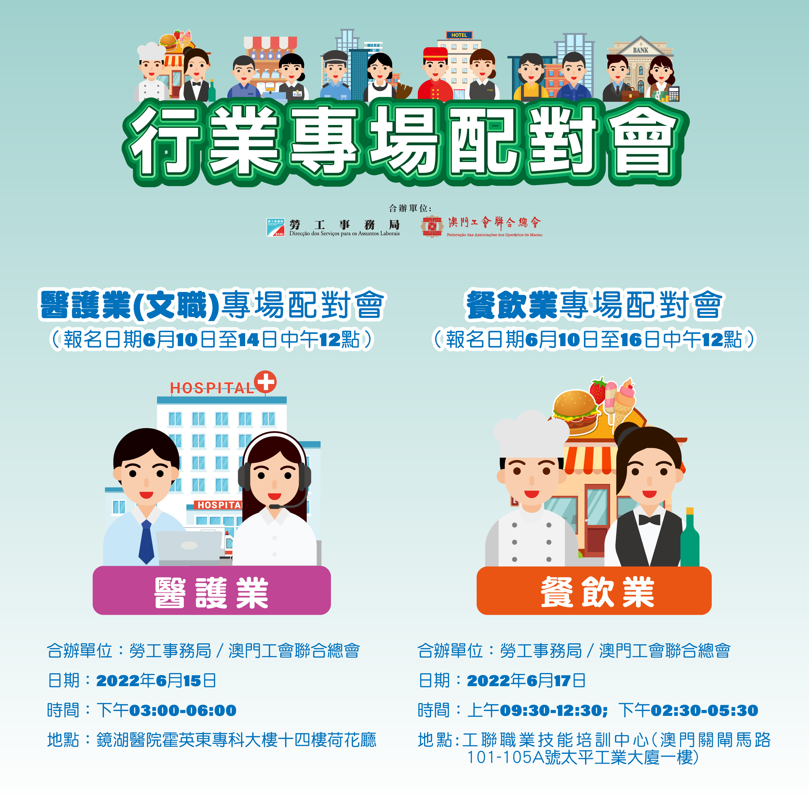 勞工事務局(下稱“勞工局”)持續關注居民的就業情況,6月份繼續與澳門工會聯合總會(下稱“工聯”)合辦9場專場配對會,當中涉及餐飲、保安清潔、醫護、社會服務及零售等多個行業。勞工局將於6月15日及17日舉辦醫護業及餐飲業專場配對會,有意參加的居民即日起可網上報名參加。
