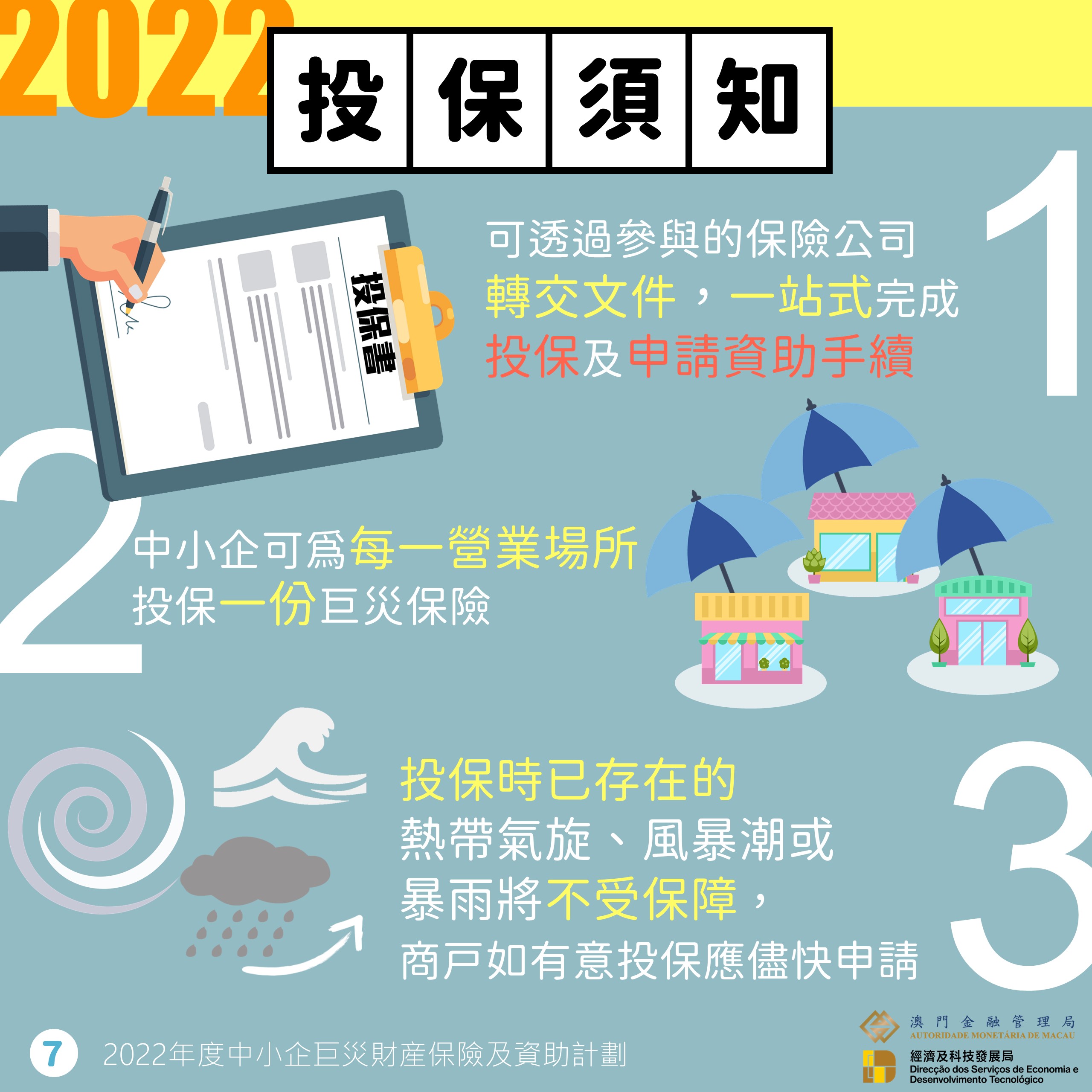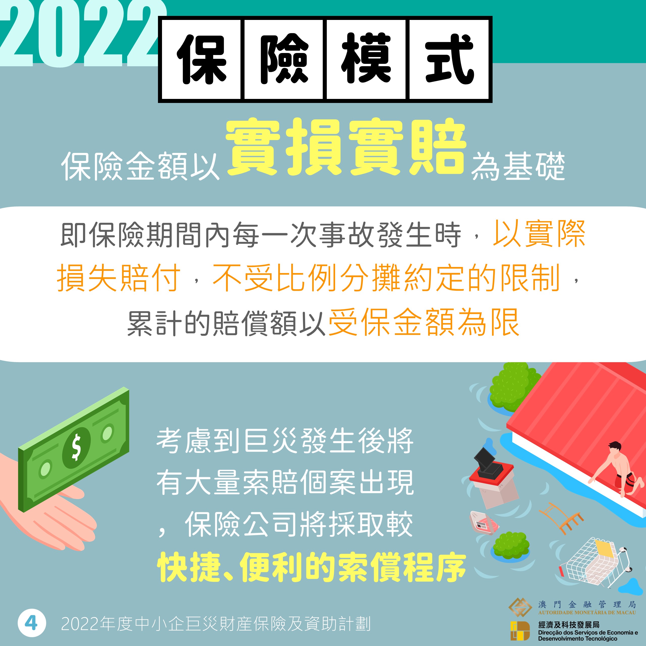 鑒於過去數年極端暴雨事件導致澳門多區水浸,金管局協調保險業界優化今年的巨災保險計劃,特別增加黑色暴雨警告信號為可索償事故。即在氣象局發出八號或以上熱帶氣旋信號、或紅色風暴潮及以上的警告、或黑色暴雨警告信號時,巨災保險將以統一保單為中小企提供財產損失的保障,並不設自負額及貨物賠償限額。