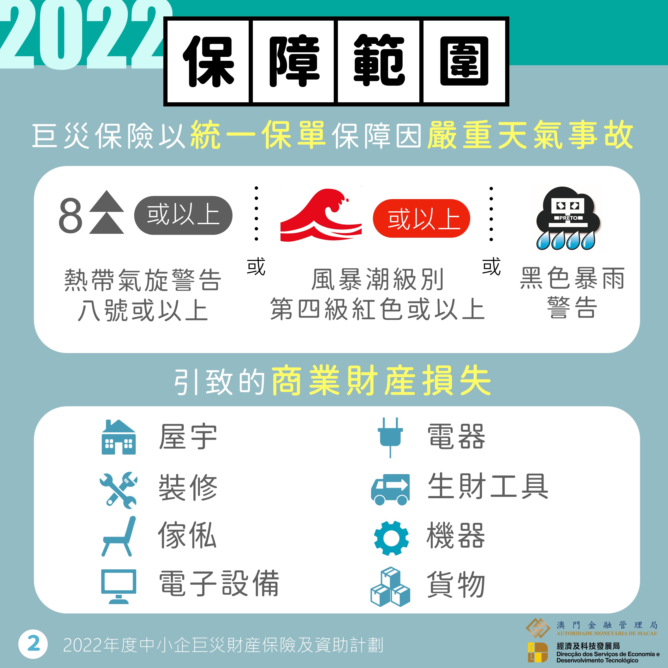 2022年度的“中小企巨災財產保險”(下簡稱“巨災保險”)及“中小企巨災財產保險資助計劃”(下簡稱“巨災保險資助”),今(13)日起至今年12月30日分別接受投保及申請,今年擴大保障範圍至黑色暴雨警告信號期間的損失,希望更切合中小企需要。