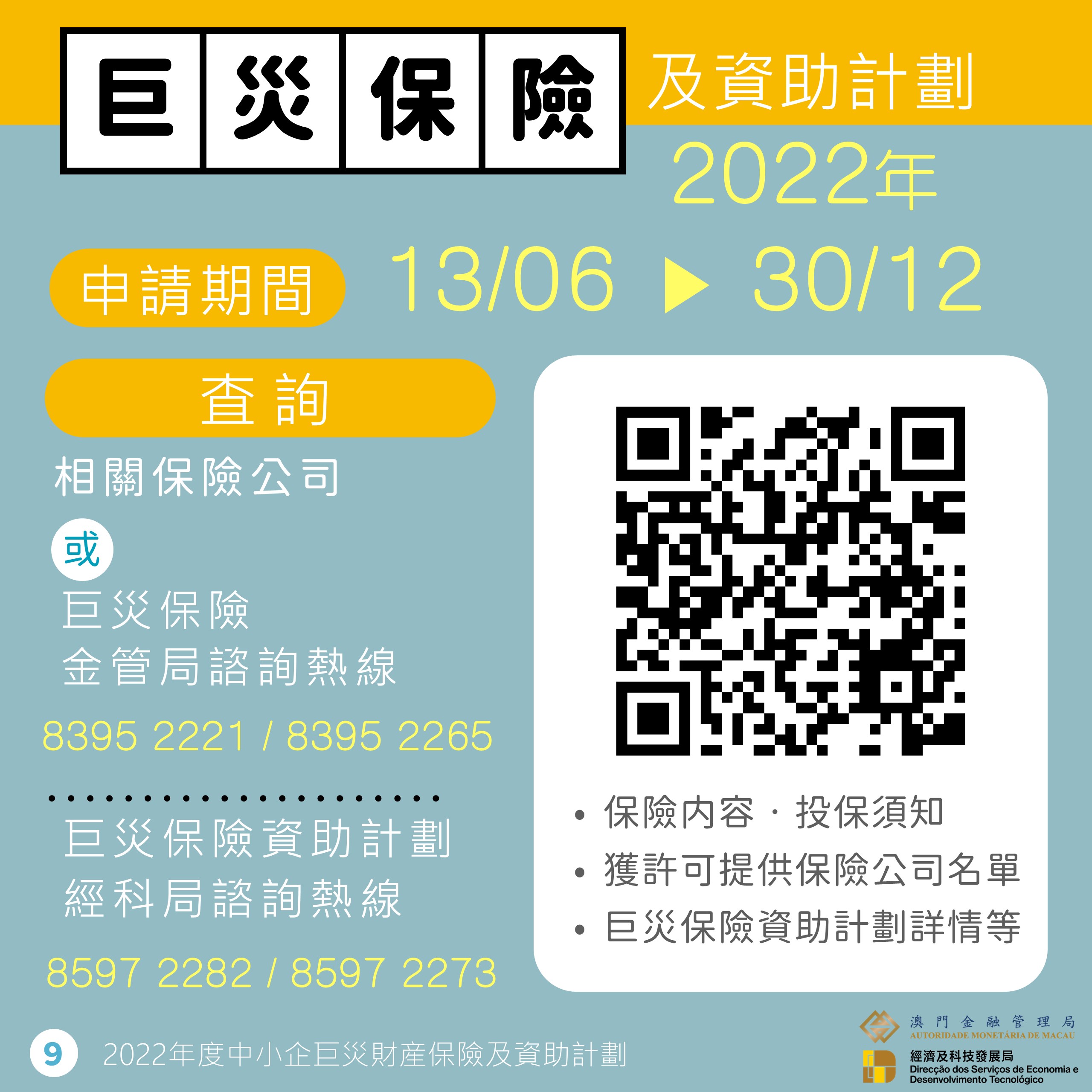 如對巨災保險有任何查詢,可直接聯絡相關保險公司,或瀏覽金管局網頁查閱(https://www.amcm.gov.mo/zh/typhoon-information/swe )。亦歡迎於辦公時間致電查詢: