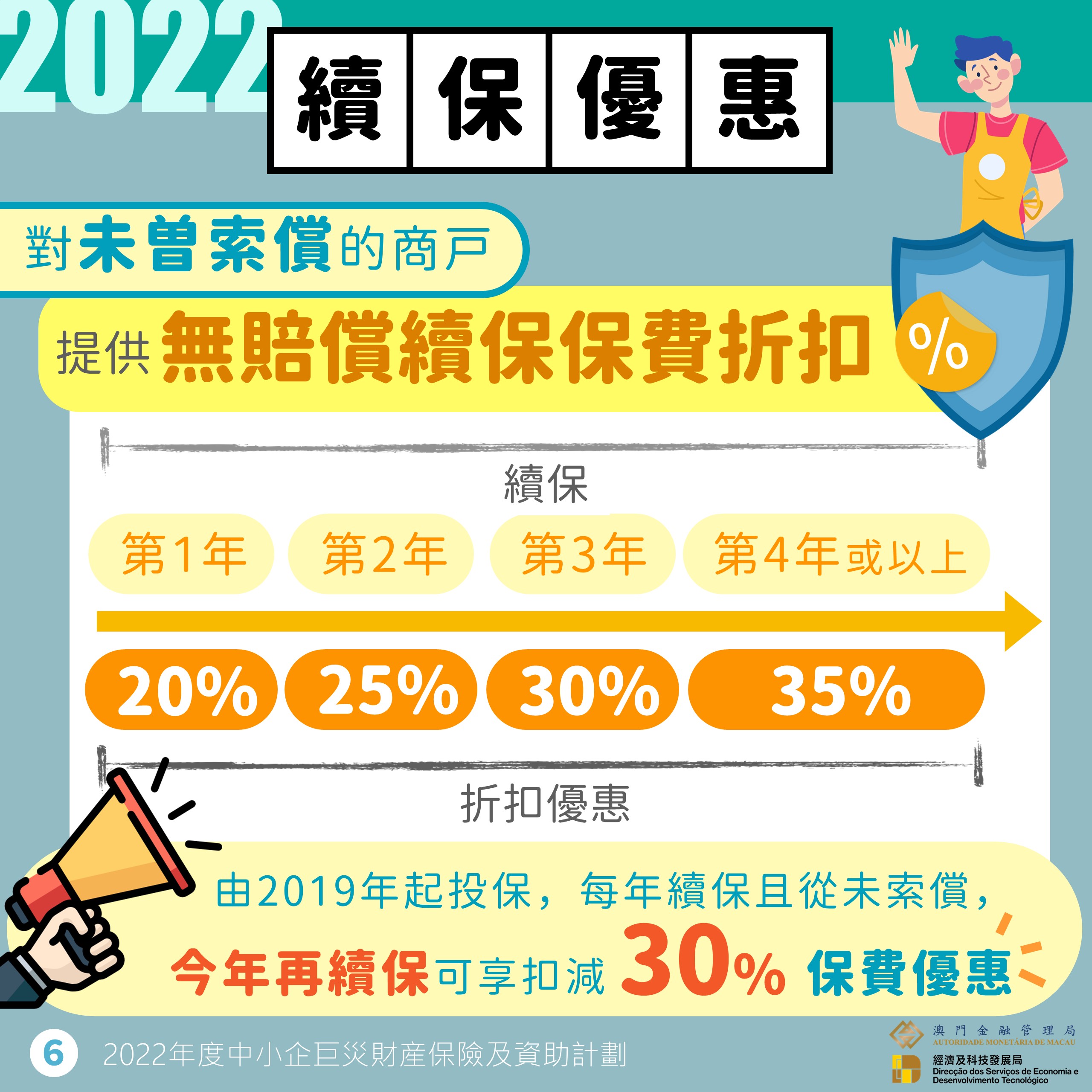 中小企可透過參與的五間本地保險公司,為每一營業場所投保一份巨災保險,保險金額可選擇10萬(澳門元,下同)、20萬或30萬,對應標準保費為25,000、50,000及75,000;未曾索償的續保商戶可繼續享有保費折扣,第一年續保有20%的折扣優惠,第二年為25%、第三年為30%、第四年或以上為35%。希望鼓勵商戶能持續投保,以管理自身風險。