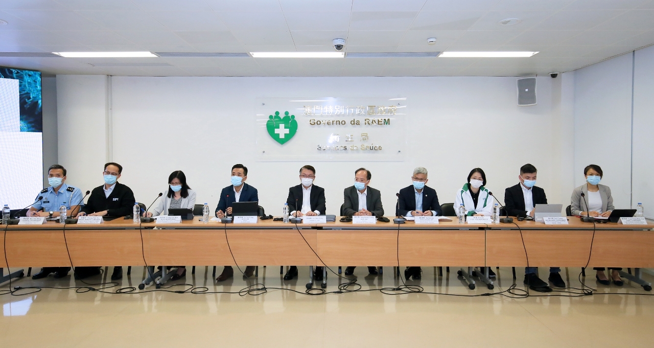 新型冠狀病毒感染應變協調中心今(19)日舉行記者會,經濟財政司李偉農司長、衛生局羅奕龍局長、財政局容光亮局長、經濟及科技發展局戴建業局長、市政署市政管理委員會柯嵐副主席、教育及青年發展局非高等教育廳張子軒廳長、衛生局疾病預防及控制中心傳染病防控處梁亦好處長、警察總局警務聯絡及公共關係處張健欣處長、治安警察局行動及通訊處馬超雄處長和旅遊局公共關係處藍同好處長共同會見傳媒。