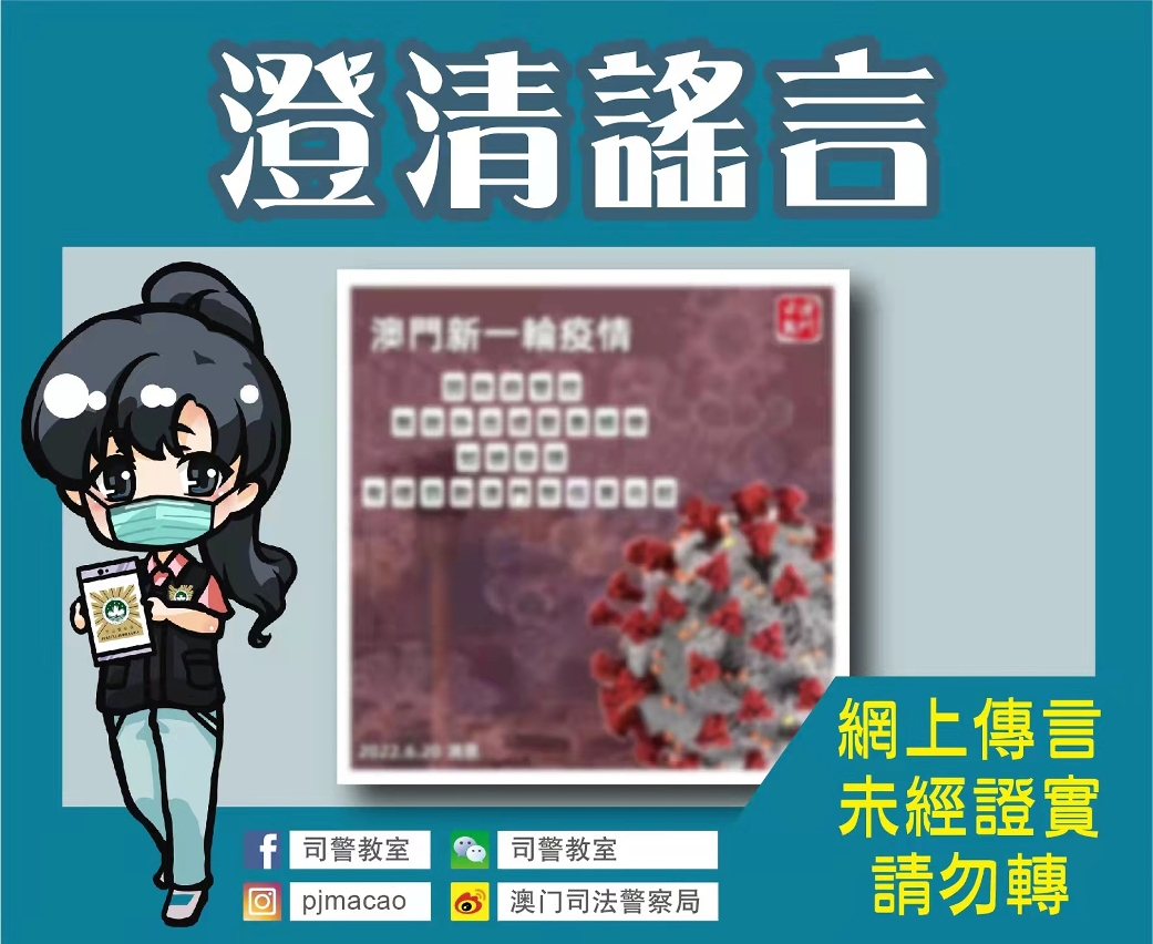 司警局在此呼籲市民倘若從網上或其他途徑得悉涉及疫情訊息時,應向新型冠狀病毒感染應變協調中心查詢熱線28700800核實查證,切勿轉發未經證實的訊息,以免造成不必要的猜測或恐慌;若懷疑遇到詐騙或知悉任何犯罪消息,應立即致電司法警察局防詐騙查詢熱線 8800 7777 或報案熱線 993 求助或舉報。