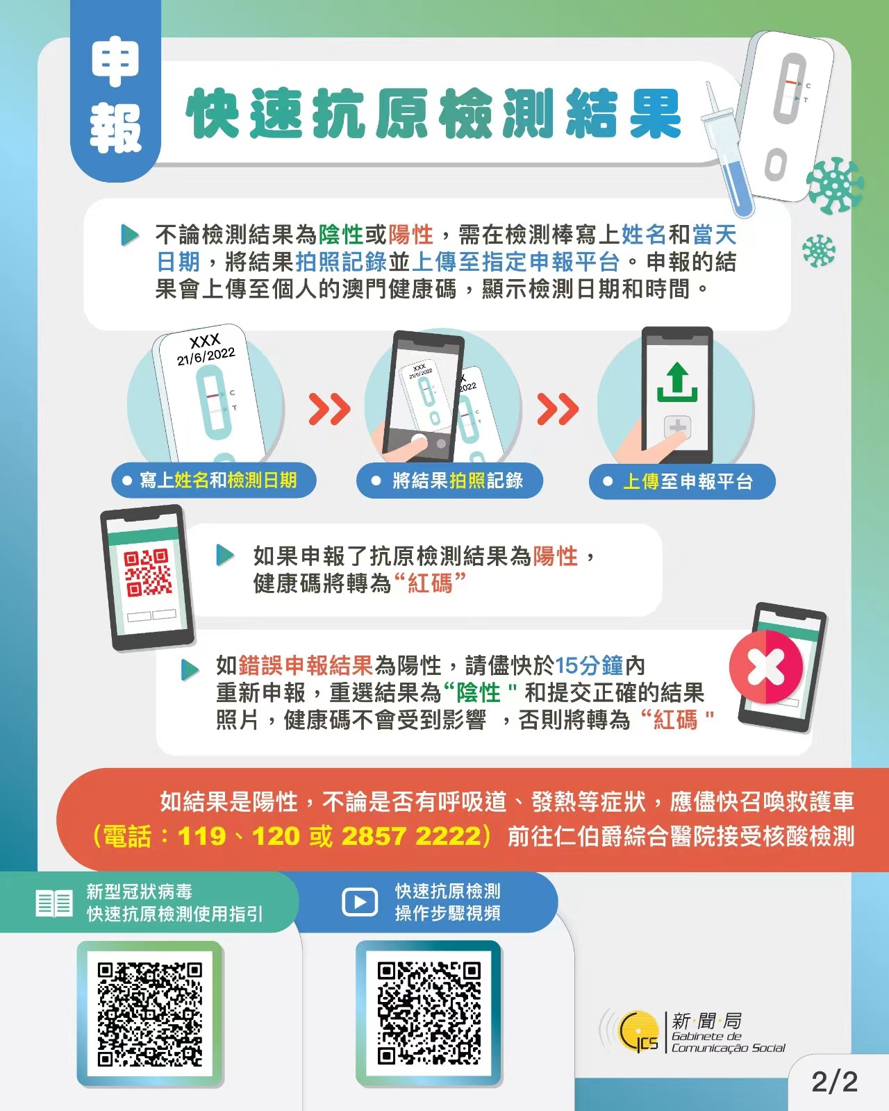 應變協調中心表示,上述檢測站均在嚴格遵守各項防疫指引的前提下為市民進行採樣,目前各站已完成清潔消毒並繼續開放。在上述時間及地點輪候採樣的市民無需擔心,應做好自我健康管理,在採樣後的兩日內可進行一次自我抗原檢測並上載檢測結果,如有不適可到醫院急診接受進一步檢查。自我抗原檢測相關資訊可瀏覽專頁 https://www.ssm.gov.mo/apps1/covidagtest/ch.aspx#clg21988。