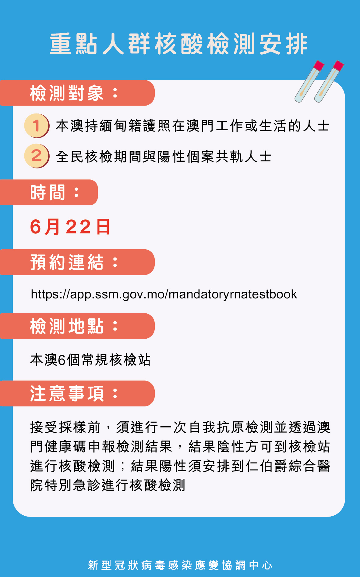 重點人群檢測對象包括:本澳持緬甸籍護照在澳門工作或生活的人士,全民核檢期間與陽性個案共軌人士,須於明(22)日透過免費排查連結:https://app.ssm.gov.mo/mandatoryrnatestbook,預約到本澳6個常規核檢站進行核酸檢測。