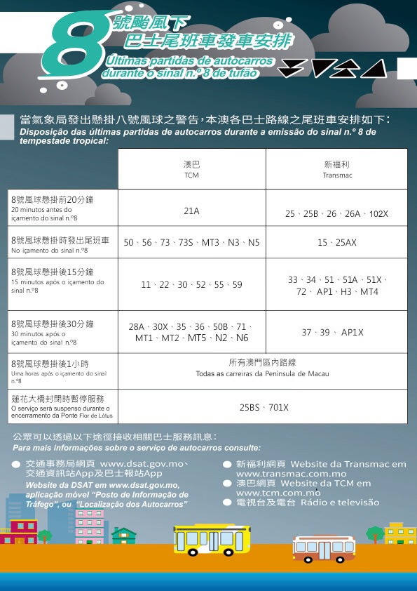本澳將於今晚9時30分懸掛八號熱帶氣旋信號,各巴士路線將於晚上9時10分起陸續發出尾班車,交通事務局已指示巴士公司加強調度疏導市民,呼籲市民避免外出及留在安全地方。輕軌於晚上8時半發出尾班車,而特別的士將於八號風球懸掛期間暫停營運。