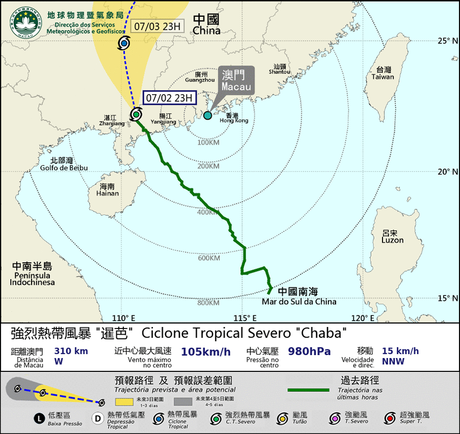 備註: 機率表提供未來一至兩天警告信號的可能情況,市民可藉此了解熱帶氣旋於指定時段內影響澳門的可能性,從而更早地妥善安排相應預防措施。請市民留意本局發佈的最新消息。