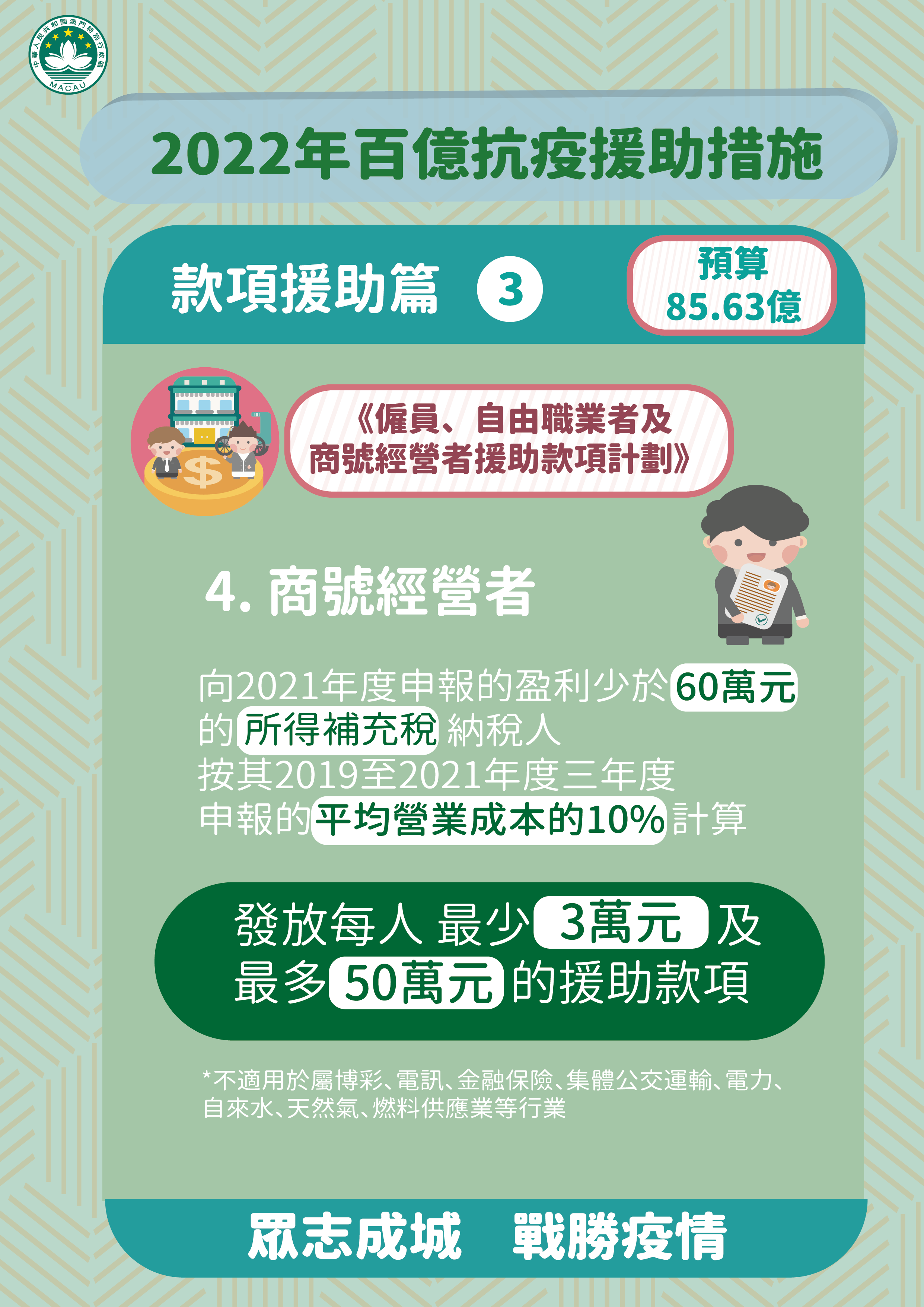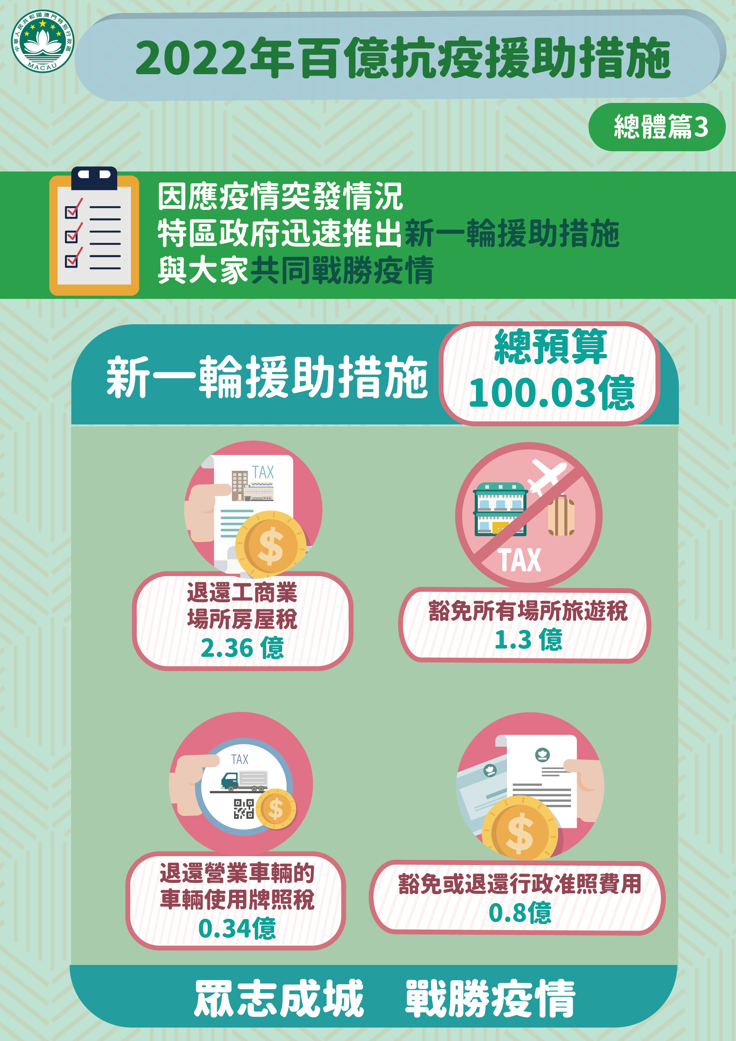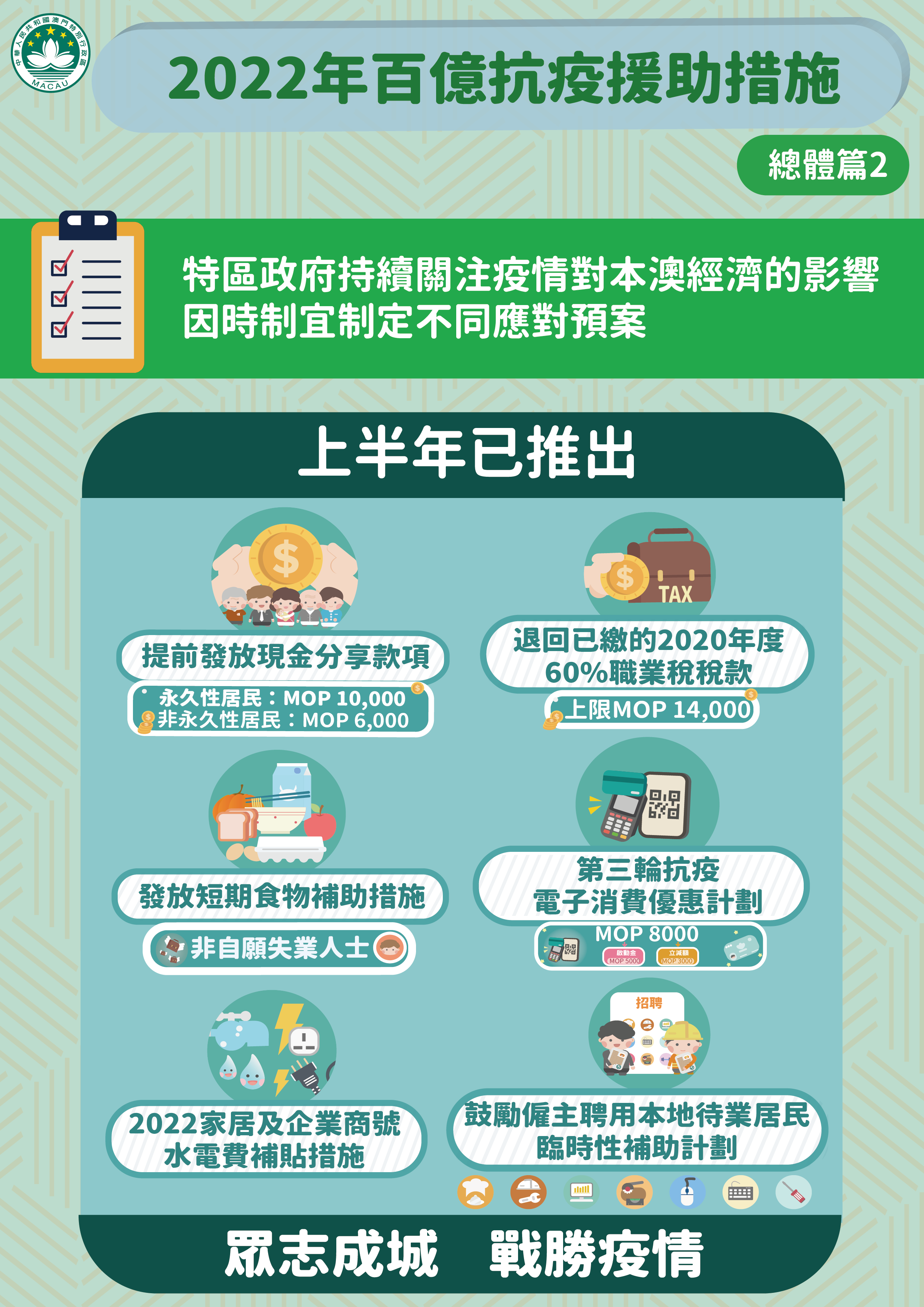特區政府因應本澳再面對疫情突發情況,迅速推出《2022年百億抗疫援助措施》。新一輪經援措施涵蓋5個方面共9項措施,包括:款項援助、就業支援、稅費減免、補貼及擴內需,預算支出超過100億澳門元。