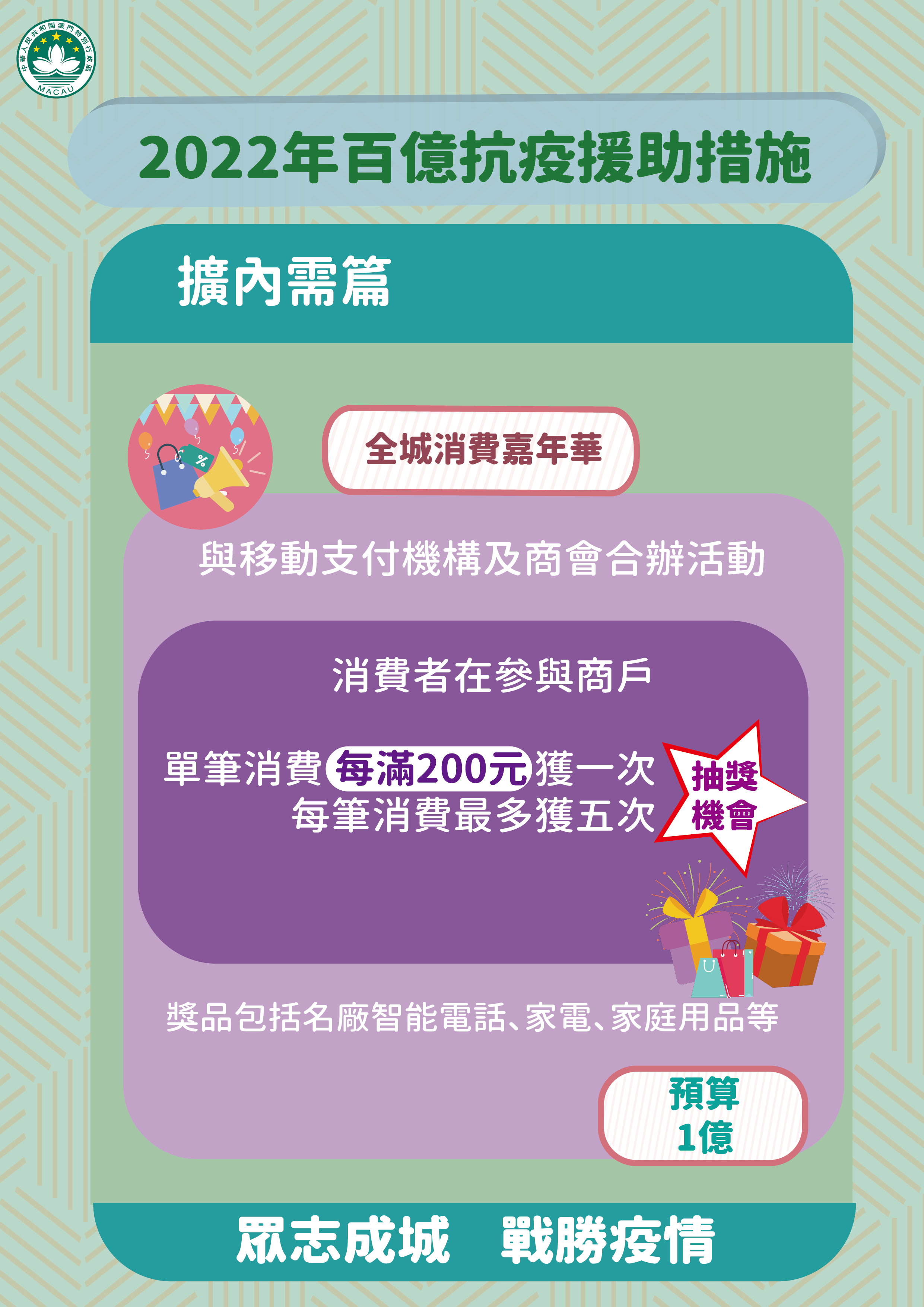 為疫後提振本澳經濟,消費者在參與活動商戶單筆消費每滿200 澳門元,可獲得一次抽獎機會,而每筆消費最多可獲五次抽獎機會。