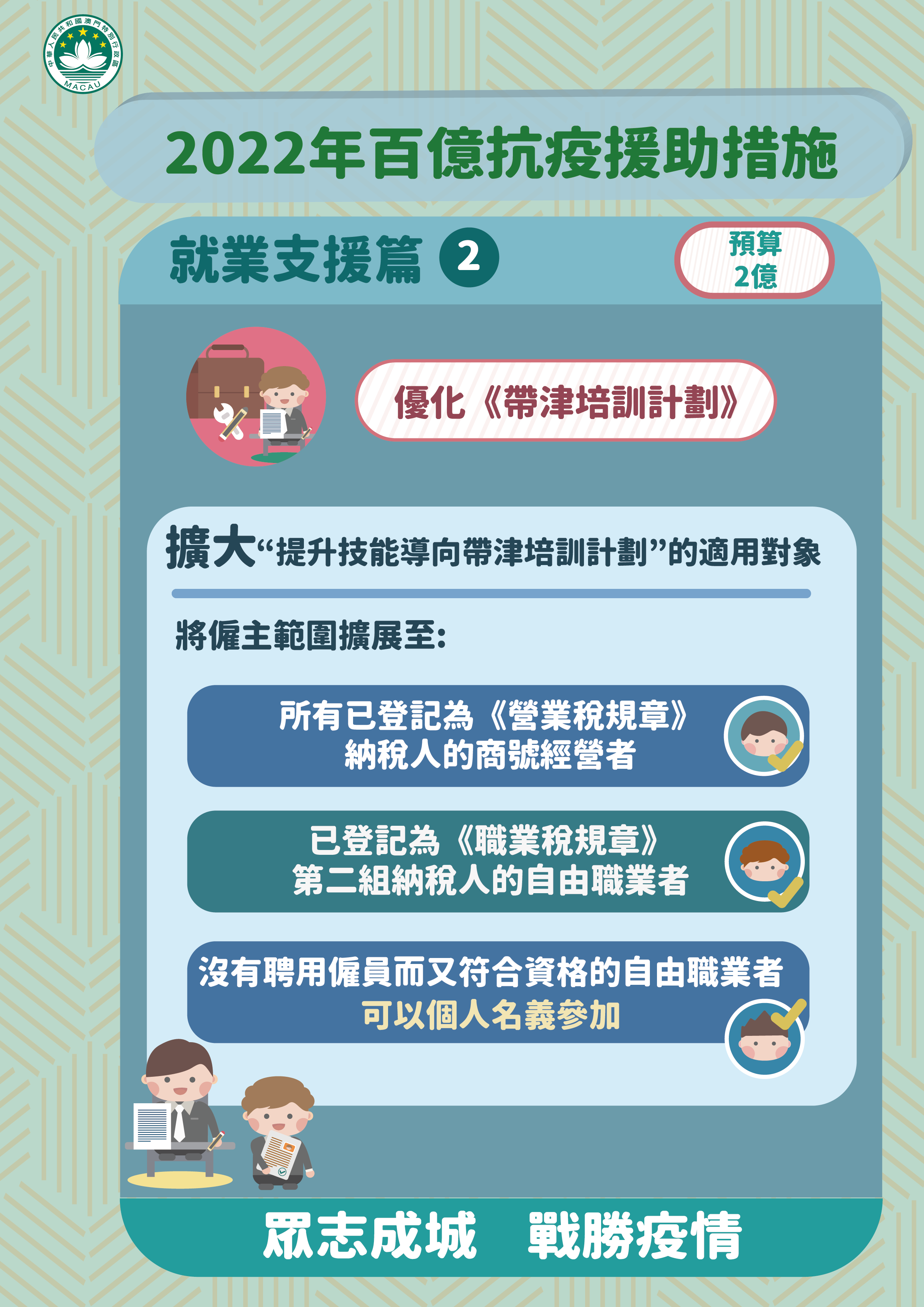 3. 擴大“提升技能導向帶津培訓計劃"的適用對象,將僱主範圍擴展至所有已登記為《營業稅規章》納稅人的商號經營者、以及已登記為《職業稅規章》第二組納稅人的自由職業者。