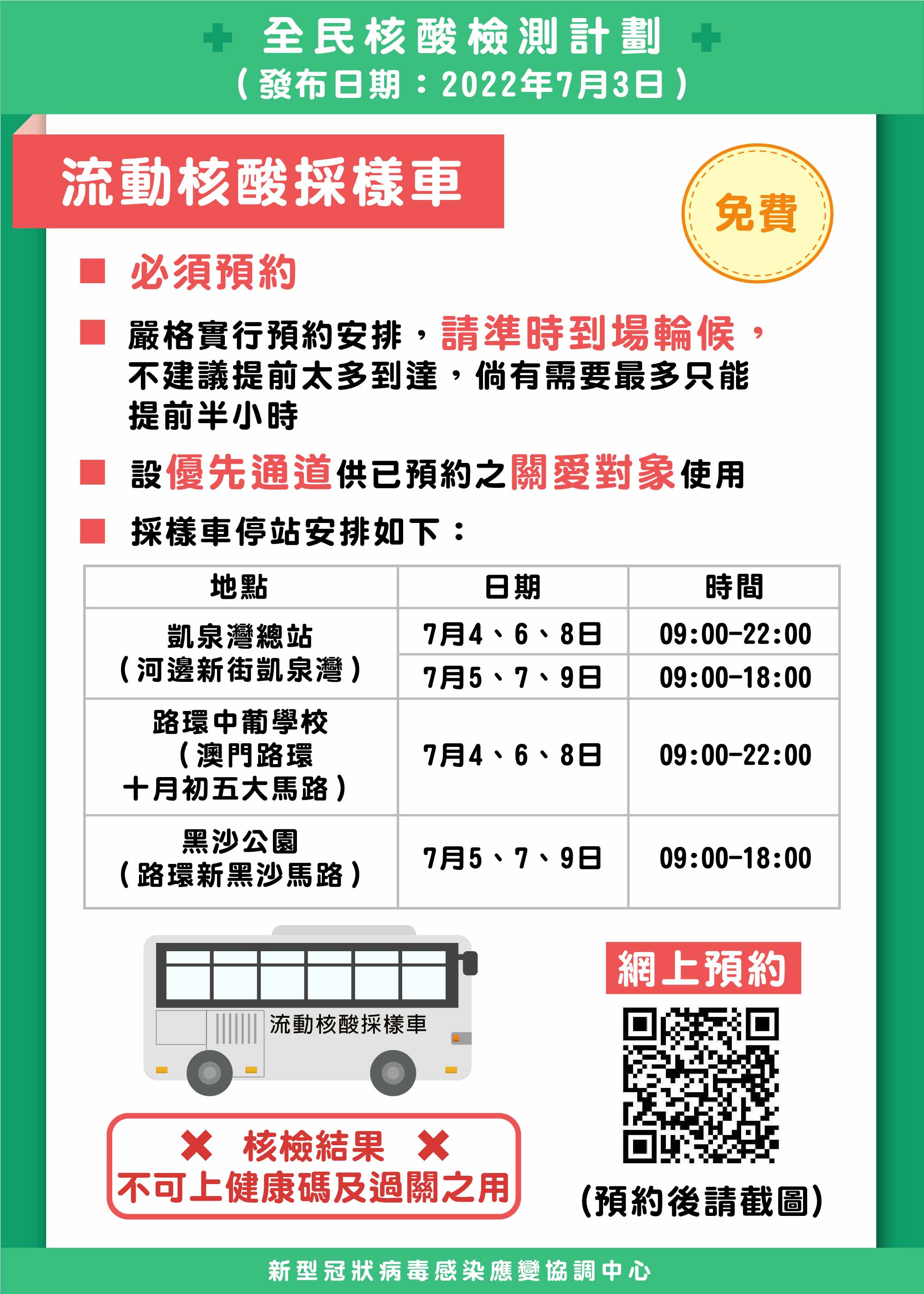 此外增設2輛流動核酸採樣車,必須預約,亦設優先通道供已預約的關愛對象使用。停站安排如下:第1輛於7月4、6、8日上午9時至晚上10時及7月5、7、9日上午9時至下午6時停泊在凱泉灣總站(河邊新街凱泉灣);第2輛分別於7月4、6、8日上午9時至晚上10時停泊在路環中葡學校(澳門路環十月初五大馬路),以及於7月5、7、9日上午9時至下午6時停泊在黑沙公園(路環新黑沙馬路),敬請市民留意。