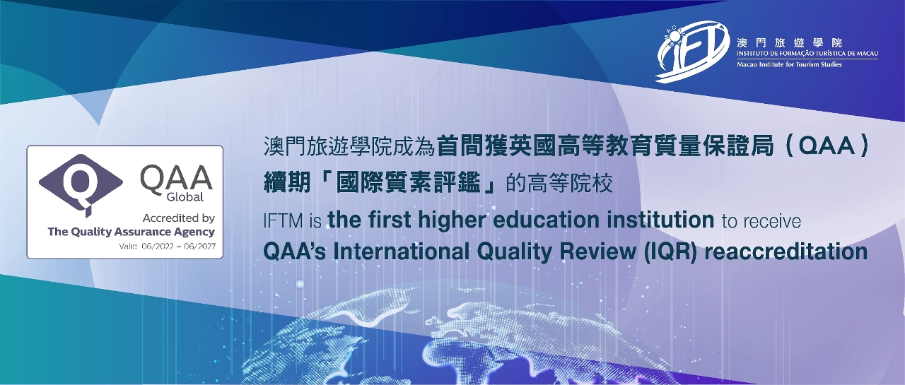 英國獨立質量及國際高等教育質素保證領域的領先者 ― 英國高等教育質量保證局(QAA)給予澳門旅遊學院續期「國際質素評鑑」,使學院成為全球首間獲得此續期認證的高等教育院校。