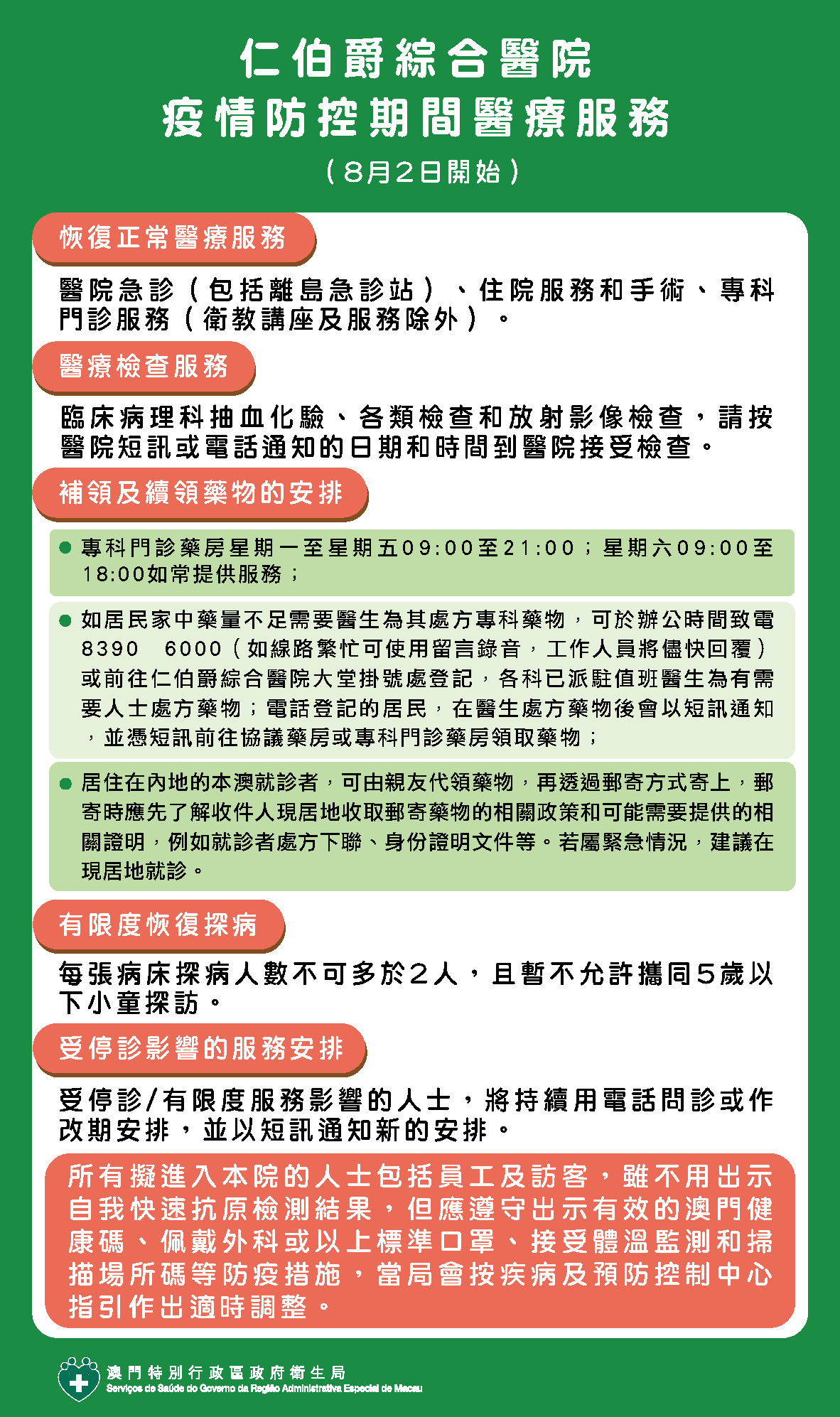 為配合特區政府的防疫措施,從8月2日起所有擬進入仁伯爵綜合醫院、衛生中心/站等衛生局轄下醫療機構的人士包括員工及訪客,雖不用出示自我快速抗原檢測結果,但應遵守出示有效的澳門健康碼、佩戴外科或以上標準口罩、接受體溫監測和掃描場所碼等防疫措施,當局會按疾病預防及控制中心指引作出適時調整。而仁伯爵綜合醫院、衛生中心/站的醫療服務、補領及續領藥物等相關安排如下: