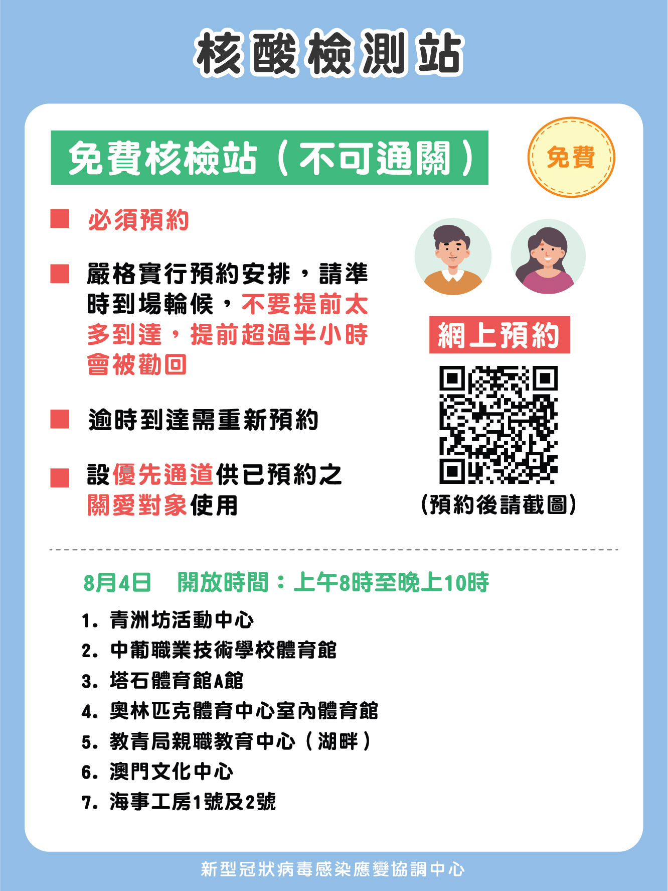 新型冠狀病毒感染應變協調中心(下稱應變協調中心)表示,為配合各類人群核酸檢測,8月4日調整核酸檢測站安排如下,全部站點必須預約,請前往核檢人士留意: