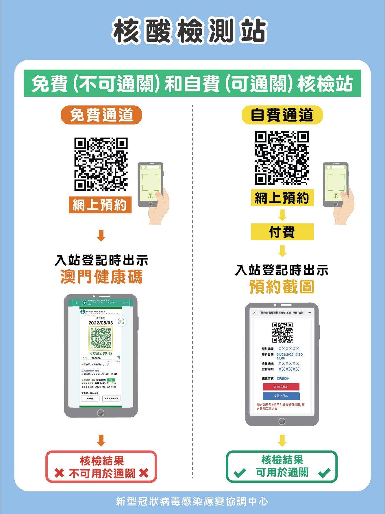 居民可透過以下連結預約進行核酸檢測:免費核檢站預約連結為 https://eservice.ssm.gov.mo/allpeoplernatestbook;自費核檢站預約連結為https://eservice.ssm.gov.mo/rnatestbook/V21/ 或 https://app.ssm.gov.mo/kkhtbook;免費核檢採樣和核檢結果可在澳門健康碼頁面顯示,但不可用作通關;自費核檢結果會上載澳門健康碼及可用作通關。