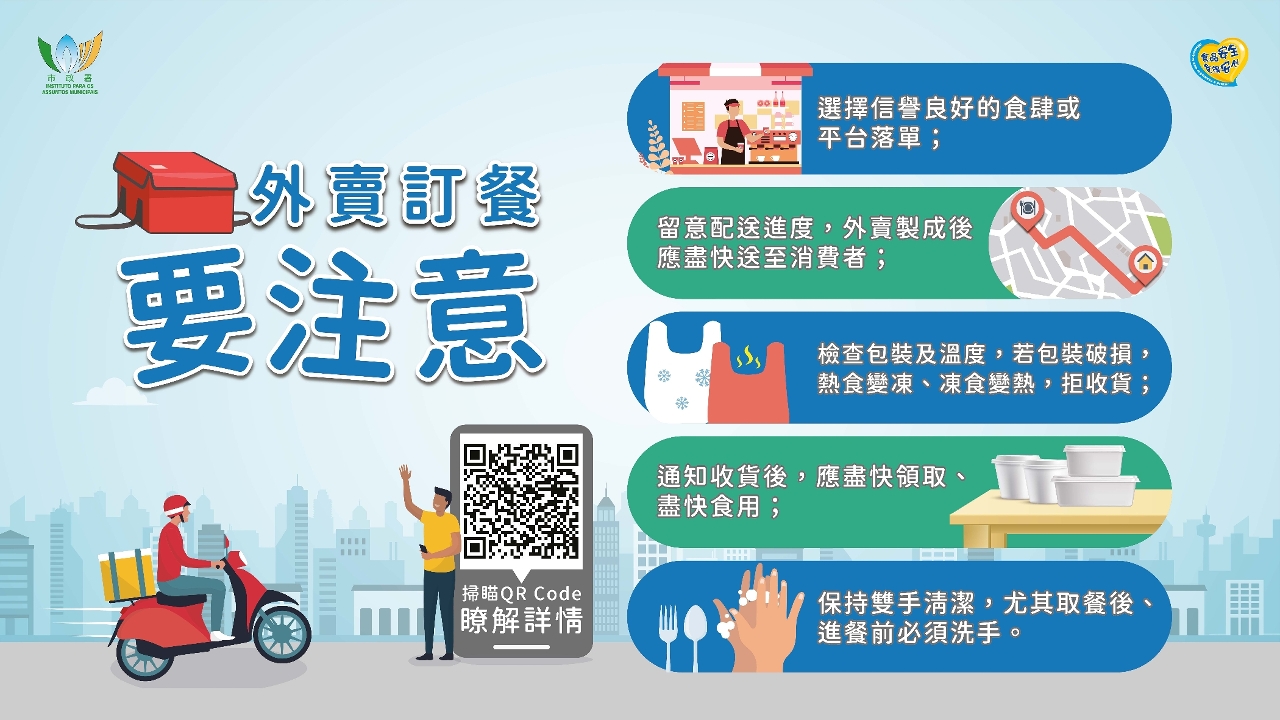 市政署亦於食安資訊網 www.foodsafety.gov.mo 及食安資訊手機應用程式設立“外賣食品安全”專頁及“夏日食品安全”專頁,提供外賣訂餐注意事項及季節性飲食安全資訊等,歡迎市民瀏覽。