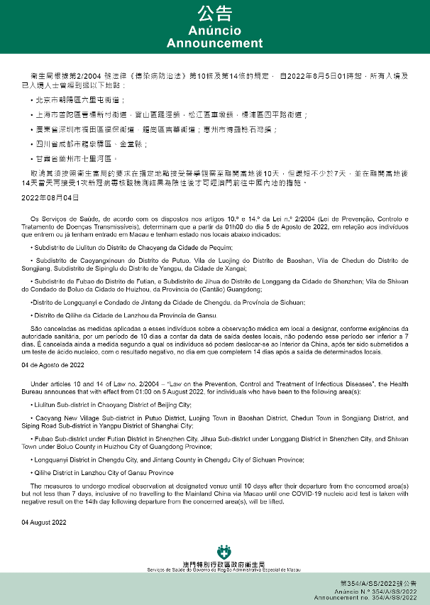 新型冠狀病毒感染應變協調中心(下稱應變協調中心)宣佈,因應內地的疫情變化,衛生局根據第2/2004號法律《傳染病防治法》第10條和第14條的規定,自2022年8月5日凌晨1時起,所有入境及已入境人士曾經到過以下地點: