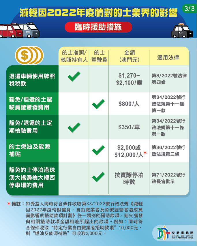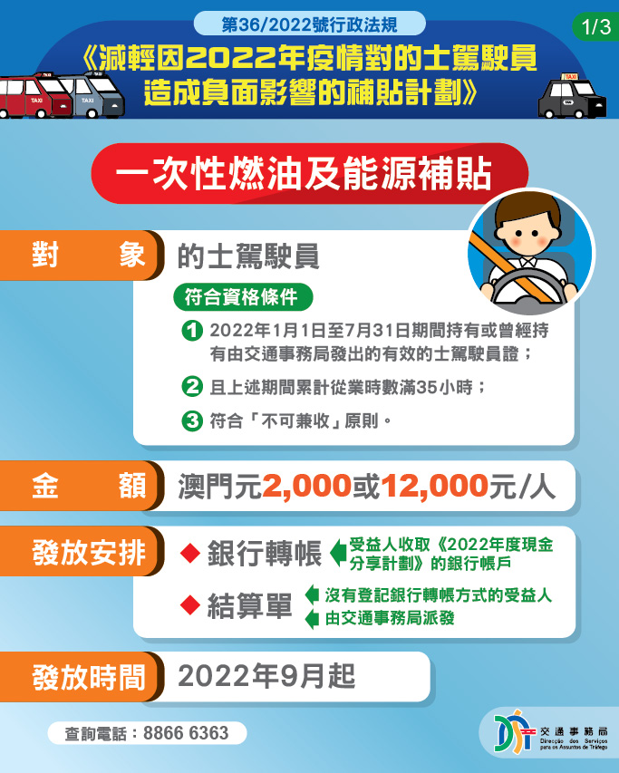 為減輕疫情對的士行業的負面影響,特區政府今(8)日公佈推出《減輕因2022年疫情對的士駕駛員造成負面影響的補貼計劃》。合資格的士駕駛員將獲發放最高澳門元12,000元的一次性燃油及能源補貼。但需要留意,如受益人同時符合條件收取《減輕因2022年疫情對僱員、自由職業者及商號經營者造成負面影響的援助款項計劃》任一類別的援助,則只會獲發與之相差多出的燃油及能源補貼款項,即澳門元2,000元。