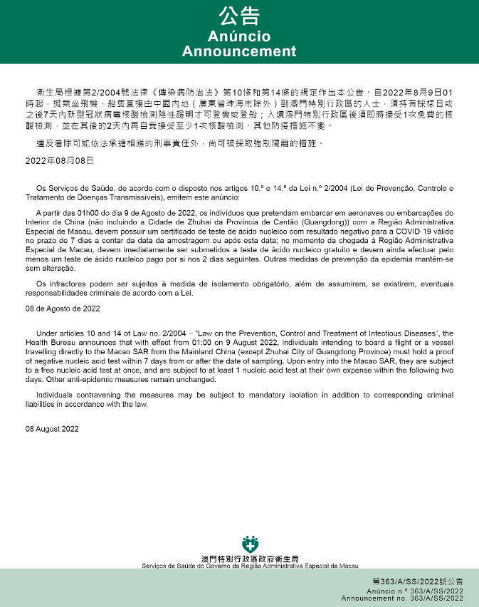 新型冠狀病毒感染應變協調中心(下稱應變協調中心)宣佈,因應內地的疫情變化,衛生局根據第2/2004號法律《傳染病防治法》第10條和第14條的規定作出本公告。自2022年8月9日凌晨1時起,擬乘坐飛機、船隻直接由中國內地(廣東省珠海市除外)到澳門特別行政區的人士,須持有採樣日或之後7天內新型冠狀病毒核酸檢測陰性證明才可登機或登船;入境澳門特別行政區後須即時接受1次免費的核酸檢測,並在其後的2天內再自費接受至少1次核酸檢測。其他防疫措施不變。