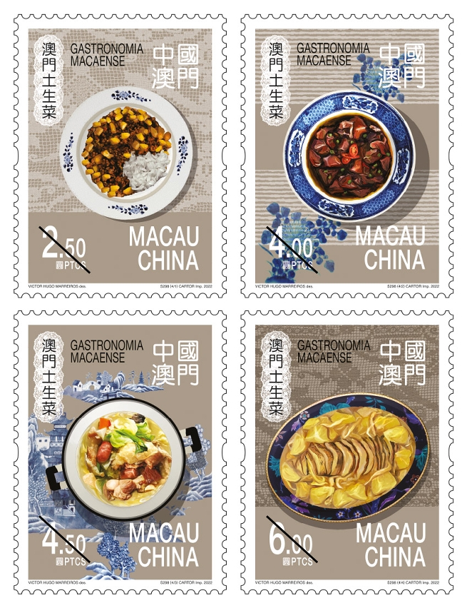 是次發行包括一套四枚郵票及一枚小型張,從澳門土生菜資料庫中挑選了五款經典菜色為郵票圖案,包括: 免治、鹹蝦酸子豬肉、大雜燴、黃薑粉豬肉及杏仁松子蛋糕。