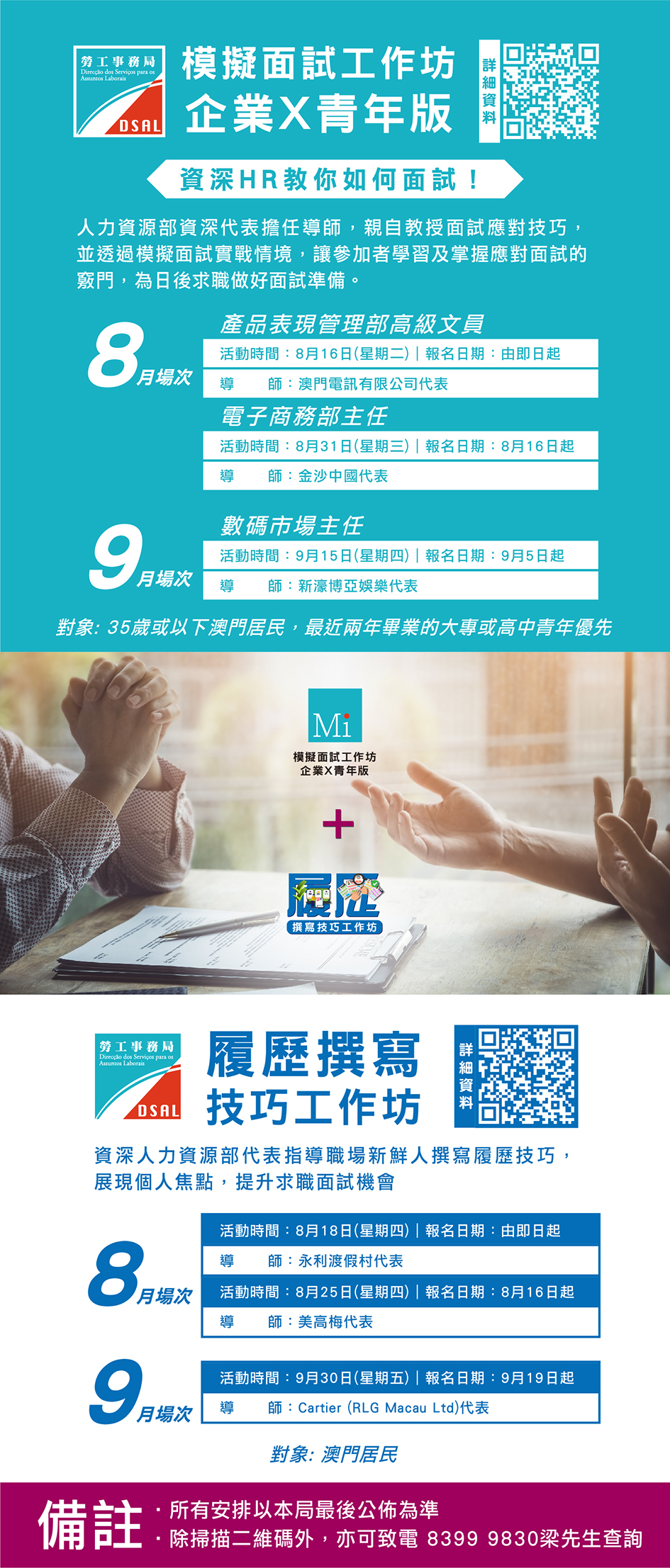 | 勞工事務局一直關注青年人就業,並適時提供各項就業支援服務,協助本澳青年順利進入職場。勞工局將於8月及9月份繼續與企業合作,舉辦“模擬面試工作坊” 及“履歷撰寫技巧工作坊”共六場,協助青年在投身就業市場前做好準備,增加獲聘機會。 |