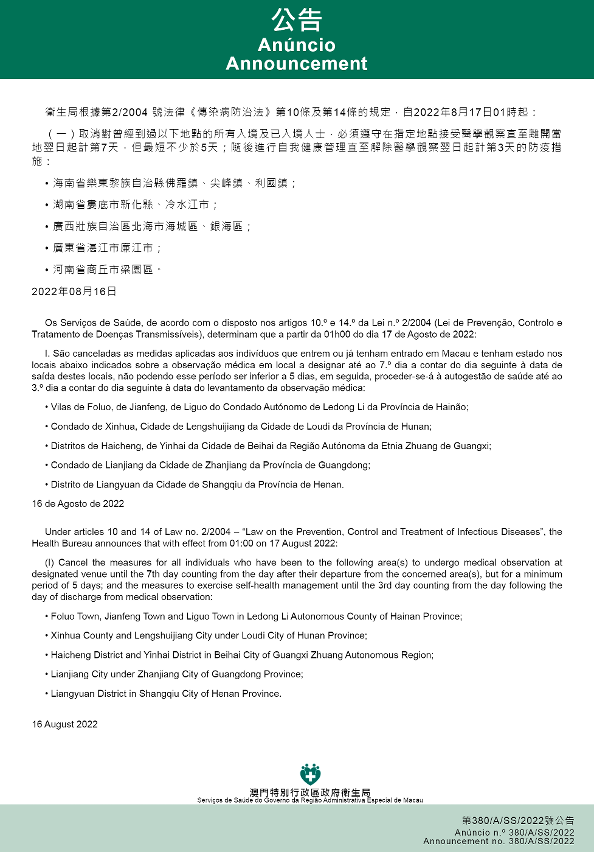新型冠狀病毒感染應變協調中心(下稱應變協調中心)宣佈,因應內地的疫情變化,衛生局根據第2/2004號法律《傳染病防治法》第10條和第14條的規定,自2022年8月17日凌晨1時起,新增或取消對曾到內地相關區域人士的防疫措施: