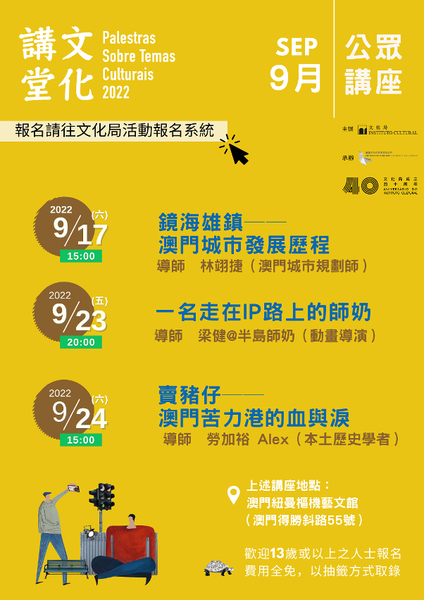 由文化局主辦的文化藝術普及計劃《文化講堂》,致力以深入淺出的方式向公眾分享豐富多元的專題講座,9月將推出3場公眾講座,包括《鏡海雄鎮—澳門城市發展歷程》、《一名走在IP路上的師奶》以及《賣豬仔──澳門苦力港的血與淚》,講座均以粵語進行,市民可於8月22日(星期一)上午10時起於文化局網頁“活動報名系統”報名,費用全免。