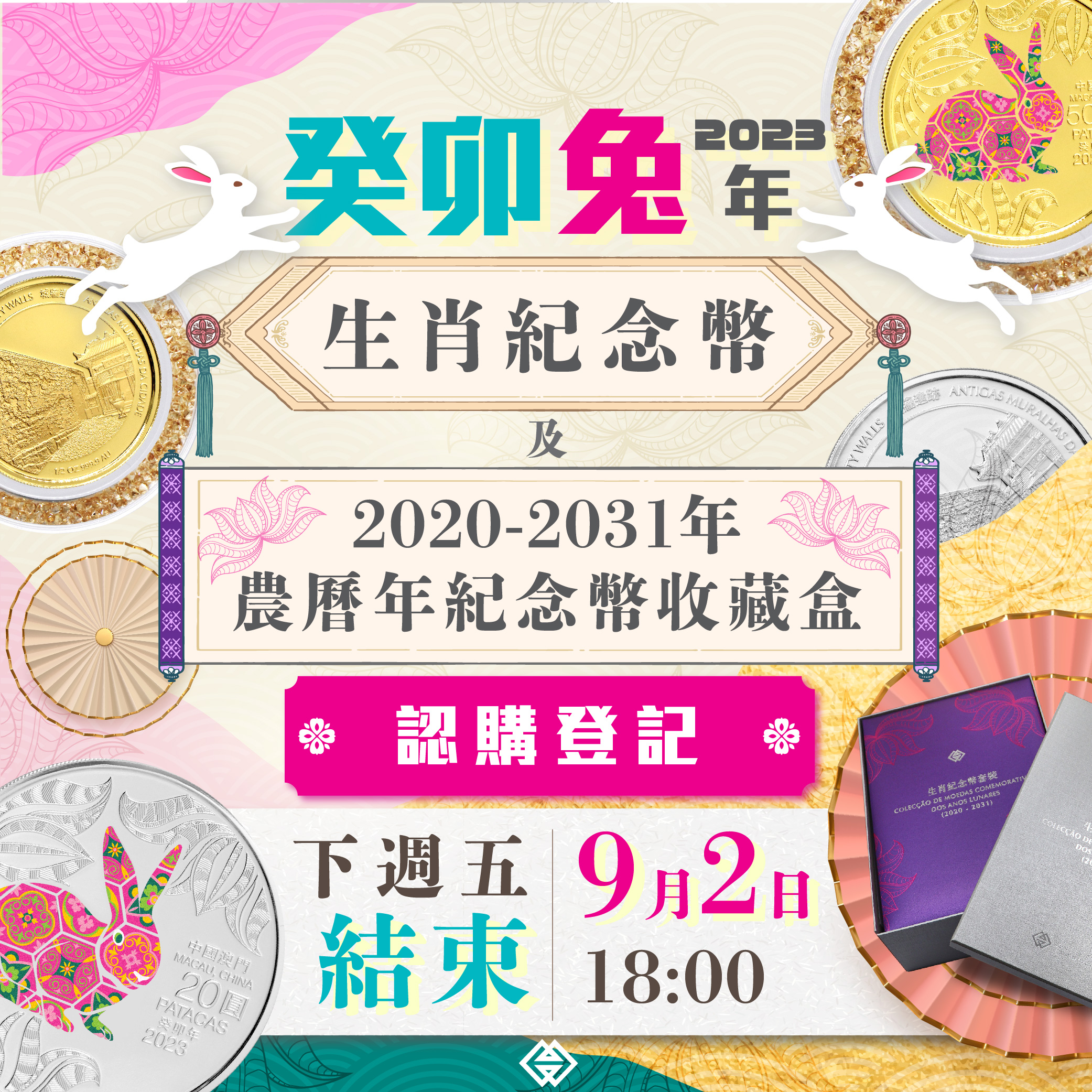 2023癸卯兔年生肖紀念幣及“2020-2031年農曆年紀念幣收藏盒”網上認購登記將於9月2日(下週五)下午6時正結束。澳門金融管理局提醒有意登記認購的市民,儘快於認購期限屆滿前辦理網上認購登記(https://www.amcm.gov.mo/static/COCSCollection_2022/terms_zh.html)。金管局大堂亦設有專櫃協助有需要的人士辦理登記認購手續。如有任何疑問,可瀏覽金管局網頁,亦可致電金管局專線2856 5071或2856 5072查詢。