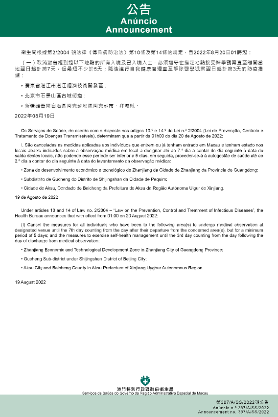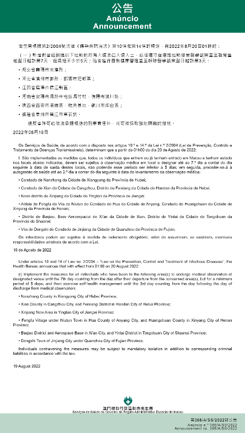 新型冠狀病毒感染應變協調中心(下稱應變協調中心)宣佈,因應內地的疫情變化,衛生局根據第2/2004號法律《傳染病防治法》第10條和第14條的規定,自2022年8月20日凌晨1時起,新增或取消對曾到內地相關區域人士的防疫措施: