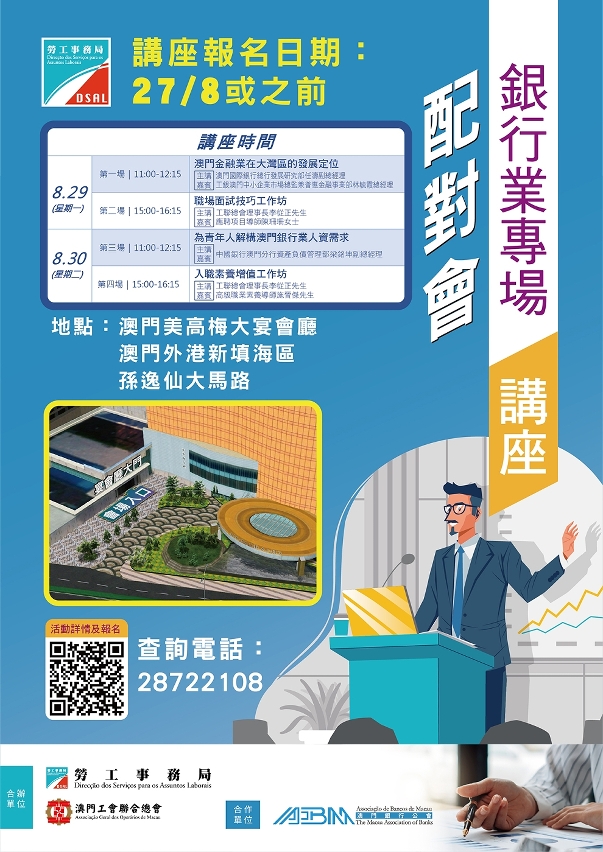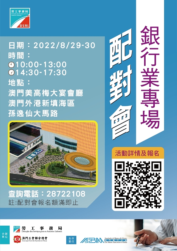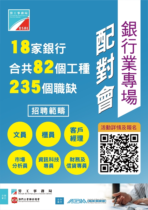 勞工事務局、澳門銀行公會與澳門工會聯合總會組織18家銀行於8月29至30日在澳門美高梅大宴會廳聯合舉辦「銀行業大型專場配對會」,提供82個工種235個職位空缺,有意投身銀行業發展的的澳門居民,可於網上預約,額滿即止。
