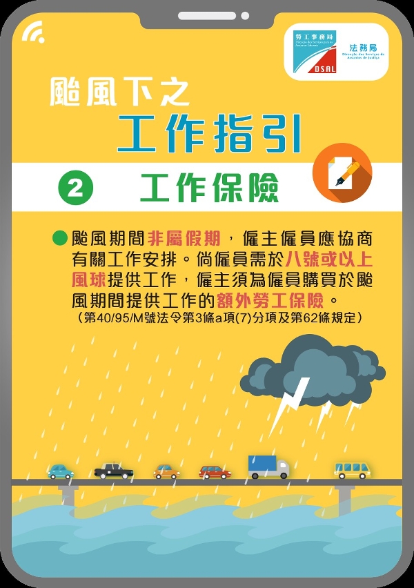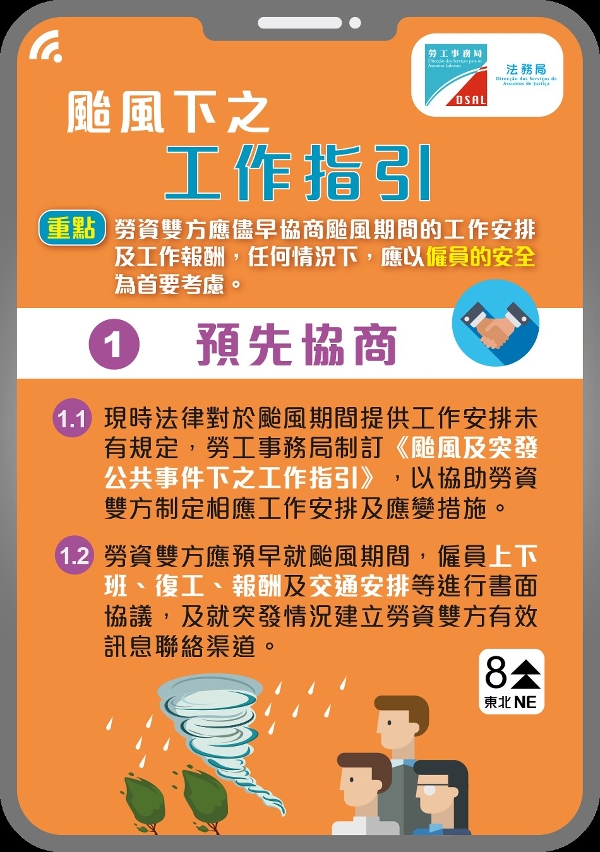 《颱風及突發公共事件下之工作指引》( https://www.dsal.gov.mo/download/pdf/function_classification/labor_problem/download/blnotice_weather_c.pdf)