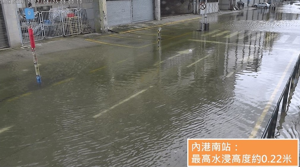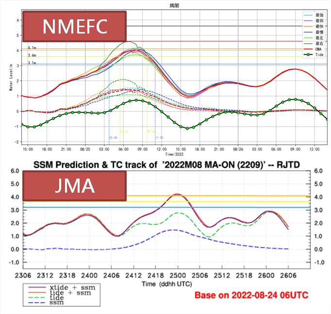 參考24日下午2時的風暴潮預報模式(圖5),大部份的輸出結果均顯示,「馬鞍」在25日早上會引起水浸且有機會達到橙色風暴潮水平;同時,本局早前推文中曾提及,強烈熱帶風暴級別或以上的熱帶氣旋,若在天文潮高位的時段,於本澳以西200公里內掠過,有機會造成最高超過1~1.5米的水浸。然而,雖然「馬鞍」最終增強至颱風級別,並於本澳以西約160公里範圍掠過,但由於其移速較預期快,且整體路徑與登陸位置比預期更西,影響了風暴潮增水的強度,也使得風暴潮最大增水時間與天文潮高位明顯錯峰,兩項消減因素影響之下,導致25日早上水浸情況沒有預期嚴重。