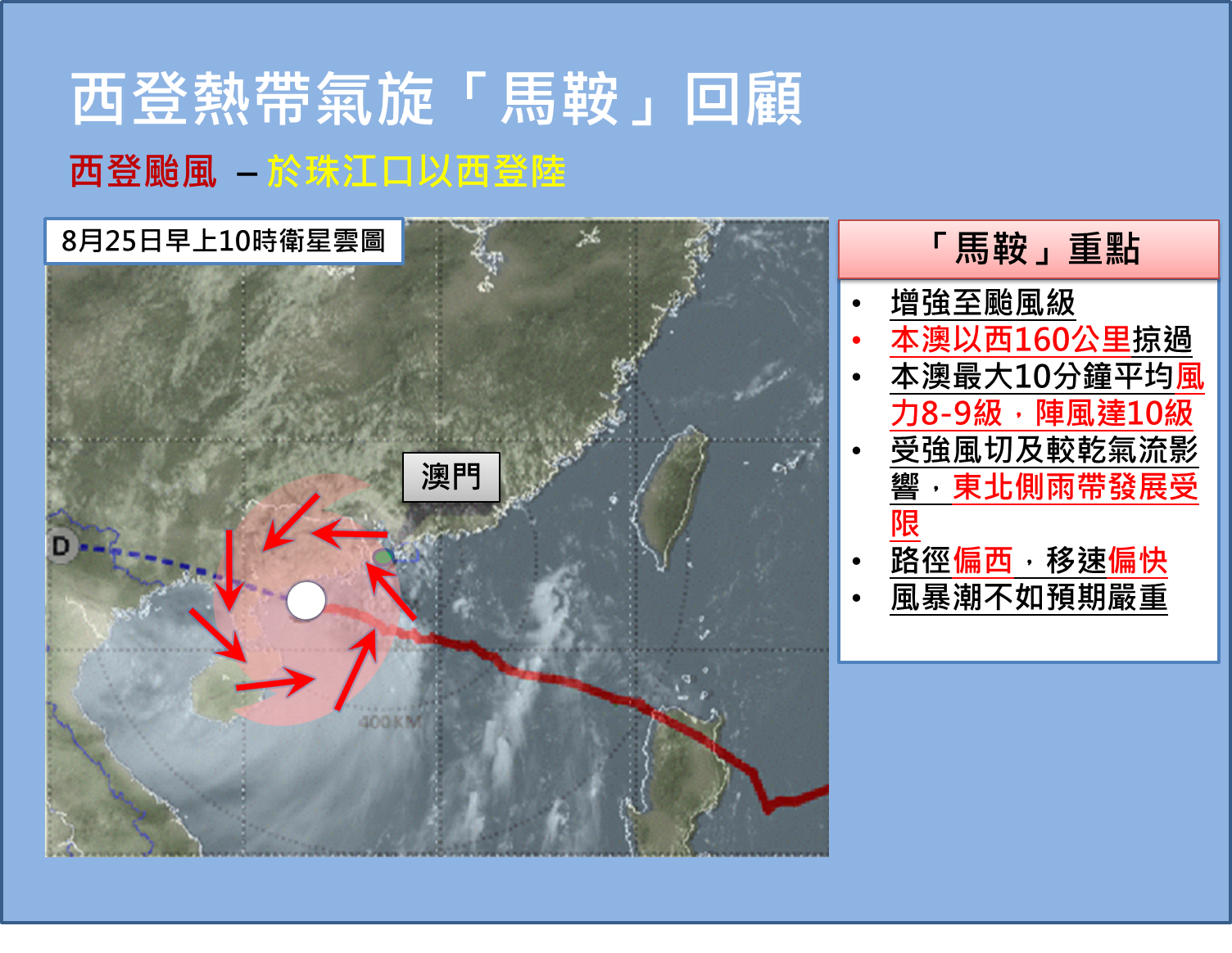 一般而言,本澳以西登陸(西登)的熱帶氣旋,為本澳所帶來之影響,會較本澳以東登陸(東登)的熱帶氣旋明顯(見圖2說明)。
