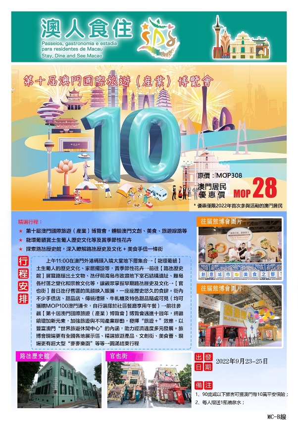 此外,適逢第10屆澳門國際旅遊(產業)博覽會舉行,將於9月23至25日增加期間限定的旅博會主題路線,以28澳門元的優惠價帶團友參與旅博會,行程還包括龍環葡韻、路氹歷史館及官也街等。團友將於出團當日獲發100澳門元餐飲卡自由用餐。