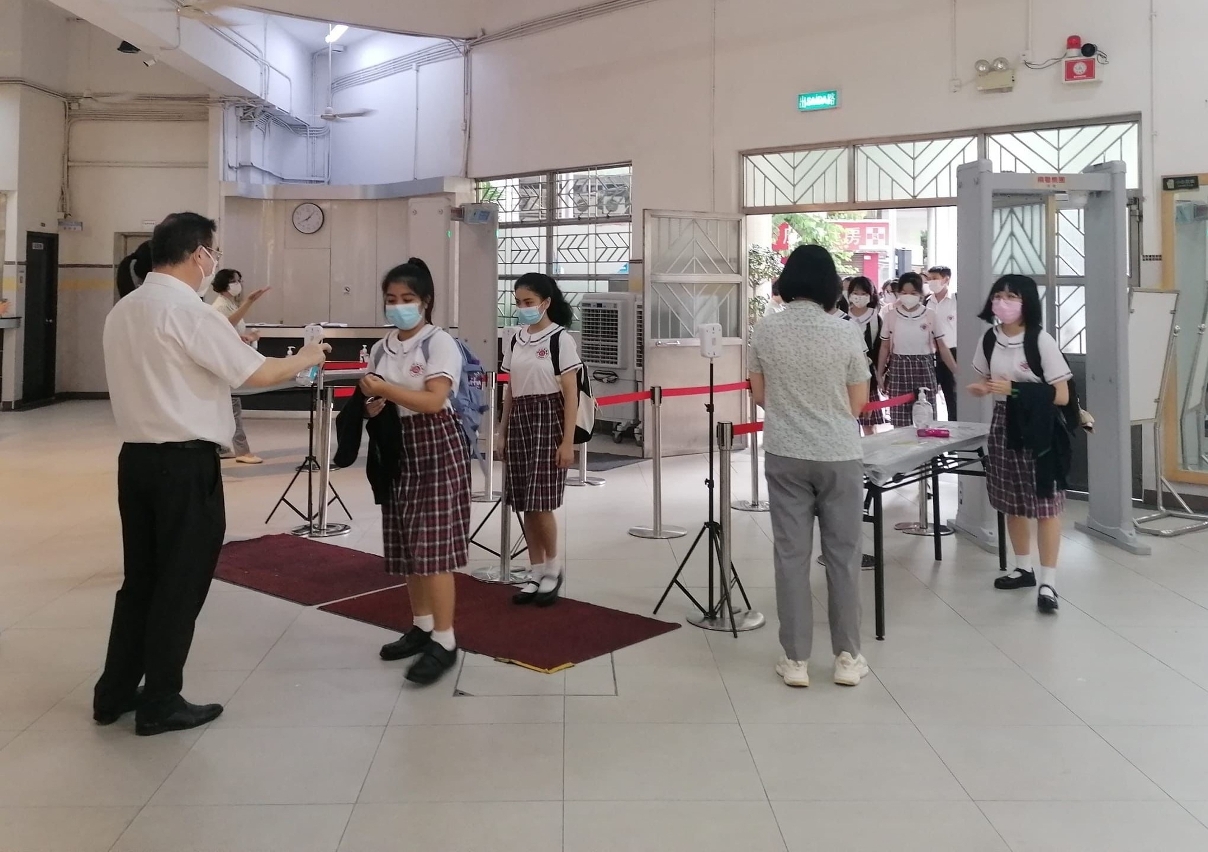 在9月1日及2日開學首兩天,教青局局長龔志明及其他領導、主管及人員分別到各所學校和出入境口岸實地了解學生上學情況;而各校亦配合防疫措施,做好學生返校工作。同時,交通事務局、治安警察局及教青局日前召開工作會議,共同協作實施新學年開學的交通安排,協調兩間巴士公司加開巴士班次,加派警員於學校附近疏導交通及維持秩序,而出入境口岸更開啟學生專道以減省跨境學生通關輪候時間。大部分家長和學生提早出門,選擇步行或乘搭公交出行,減輕開學時段的交通壓力;而學校亦安排教職員於校門外疏導人流,為所有進入校園的師生測量體溫,檢查健康碼和核酸檢測資料,使用搓手液清潔雙手,有序進入校園和課室,整個過程運作順暢。