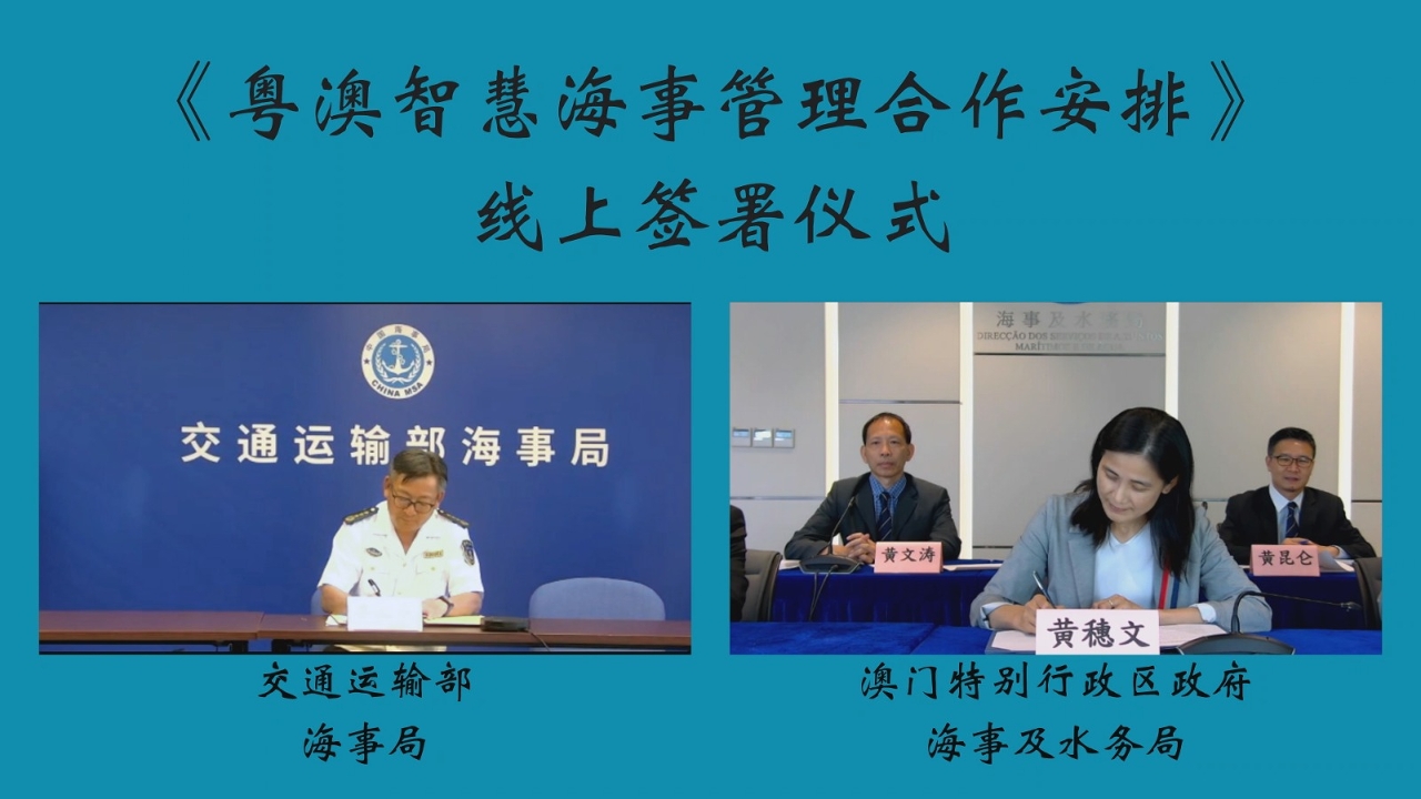 爲落實《粵港澳大灣區海事合作協議》,服務粵港澳大灣區水上交通安全、便捷、綠色、創新發展,交通運輸部海事局與澳門海事及水務局今日(9月5日)簽署了《粵澳智慧海事管理合作安排》(下稱合作安排),合作推進智慧海事系統(澳門版)的應用,共同提升大灣區的海事管理與服務能力。