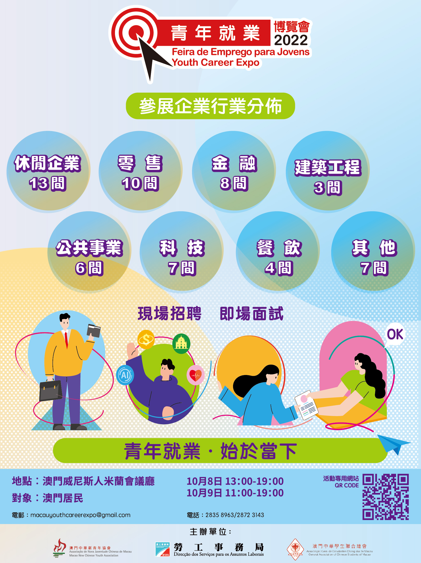 勞工事務局、澳門中華新青年協會及澳門中華學生聯合總會聯合定於本年10月8及9日假澳門威尼斯人會議廳聯合舉辦“青年就業博覽會2022”(下稱活動),主題為“青年就業,始於當下”。為協助求職青年盡快投身就業市場,今年活動以大型招聘會形式舉行,即日起開通網上求職平台。