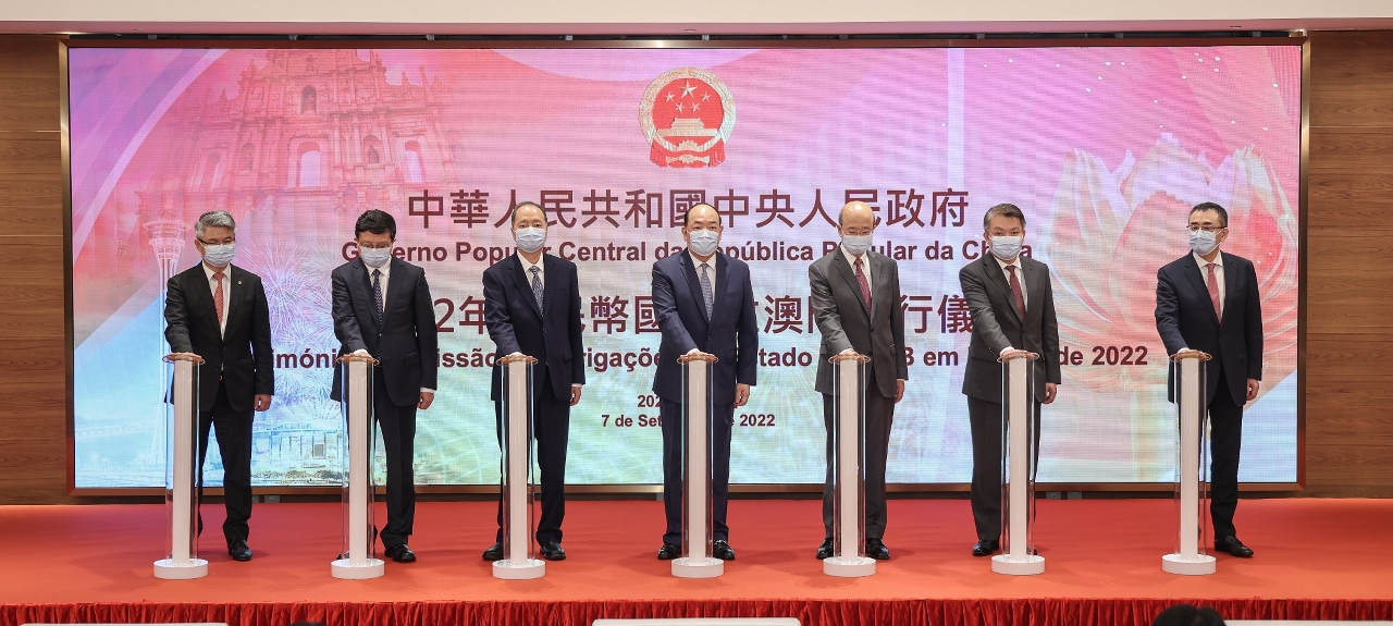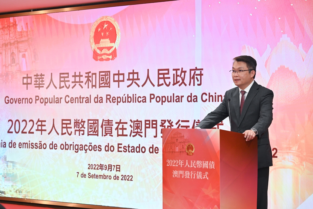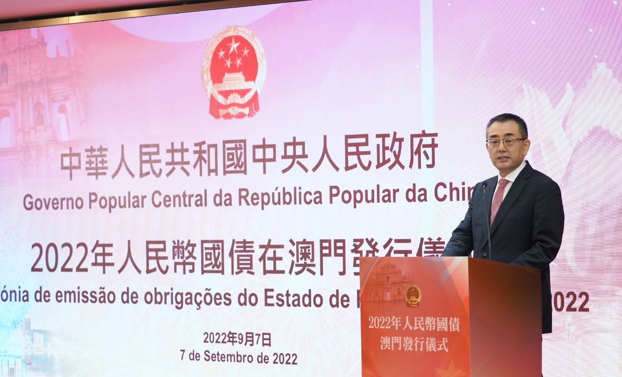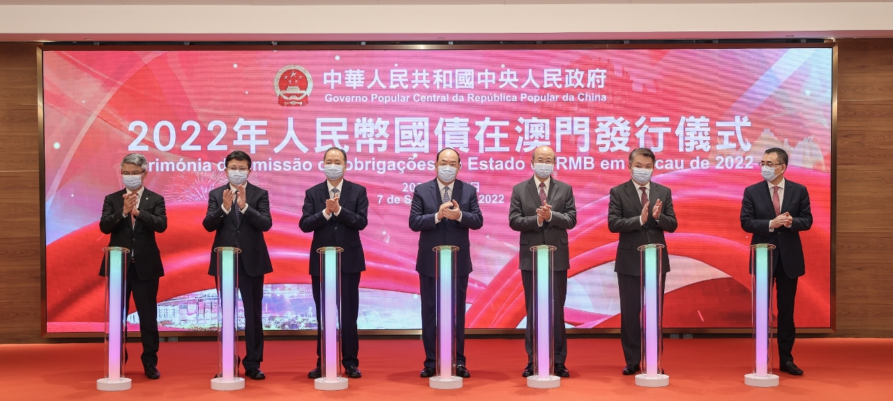 中央人民政府2022年人民幣國債在澳門發行儀式,今(7)日上午在中國與葡語國家商貿合作服務平台綜合體舉行,行政長官賀一誠、中央政府駐澳門聯絡辦公室主任鄭新聰、外交部駐澳門特派員公署特派員劉顯法、國家財政部金融司司長王克冰、澳門經濟財政司司長李偉農以及相關金融機構代表出席了發行儀式。李偉農、王克冰、中國銀行副行長林景臻,以及交通銀行副行長郭莽在儀式上致辭。