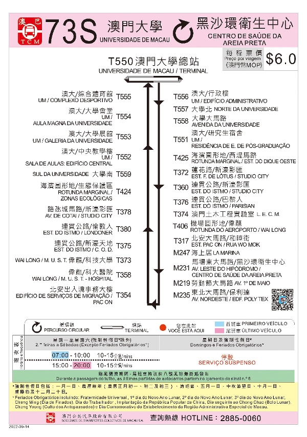 - 73特班車(73S)增加停靠澳門土木工程實驗室、新濠影匯及蓮花路等站點,使澳大及科大師生可透過轉乘701X路線往返橫琴口岸。