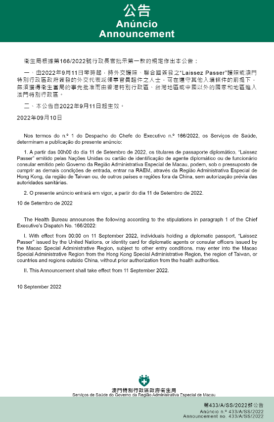 第433/A/SS/2022號公告,自2022年9月11日零時起,持外交護照、聯合國簽發之Laissez Passer護照或澳門特別行政區政府簽發的外交代表或領事官員證件之人士,可在遵守其他入境條件的前提下,無須獲得衛生當局的事先批准而由香港特別行政區、台灣地區或中國以外的國家和地區進入澳門特別行政區。